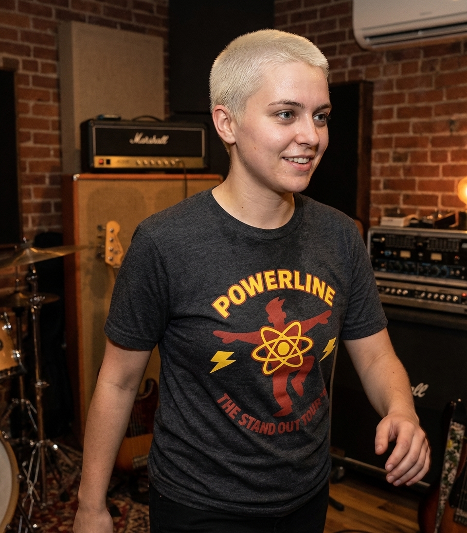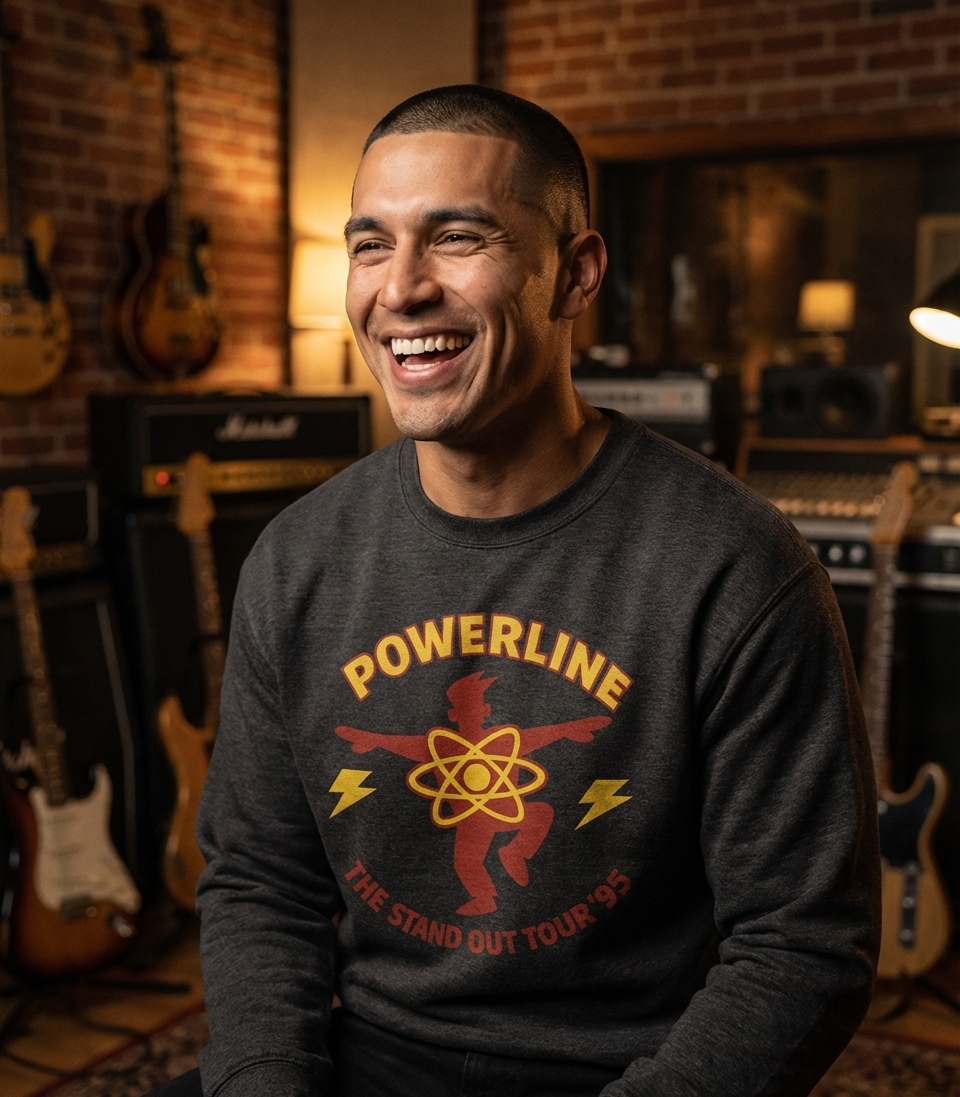 "POWERLINE" refers to the fictional pop music icon from a beloved 1990s animated film. "THE STAND OUT TOUR '95" specifically references his iconic, high-energy concert tour from that same year, symbolizing a pivotal moment in the movie's storyline.