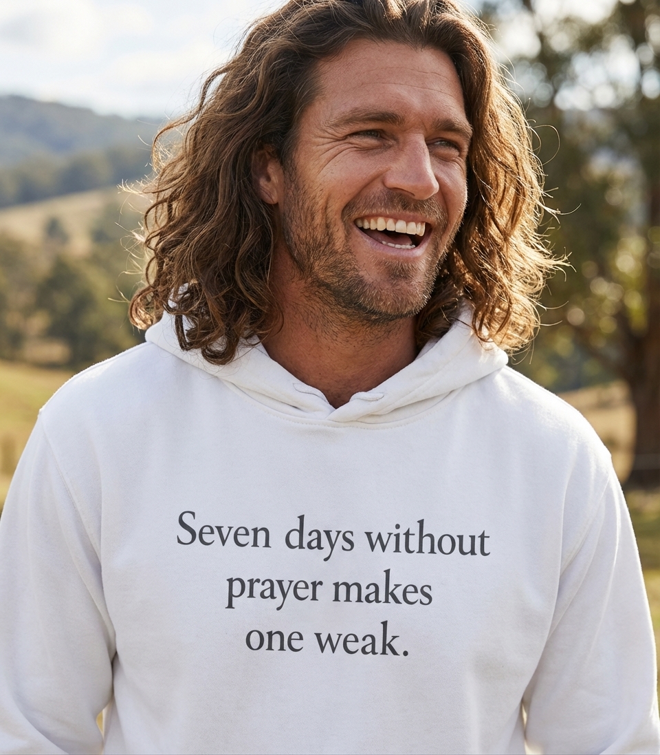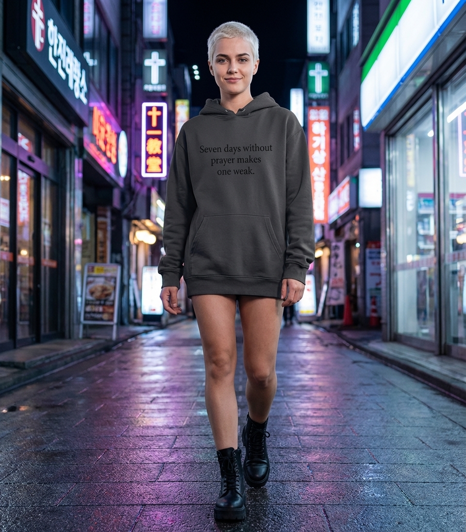 The phrase "Seven days without prayer makes one weak" is a clever play on words. It highlights the belief that spiritual strength and resilience are nurtured through regular prayer, implying that neglecting this practice can lead to spiritual 'weakness'.