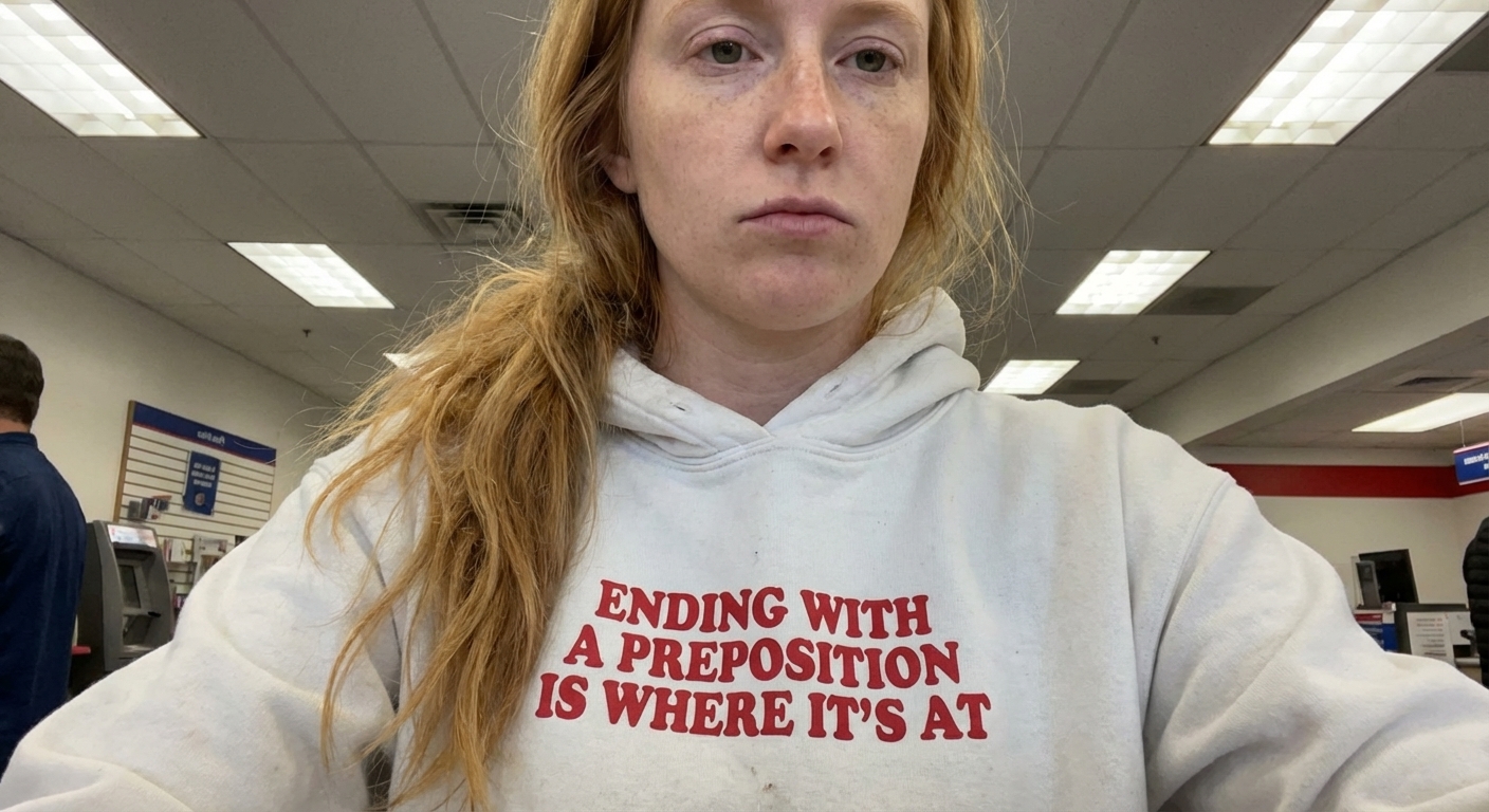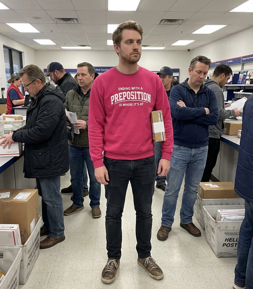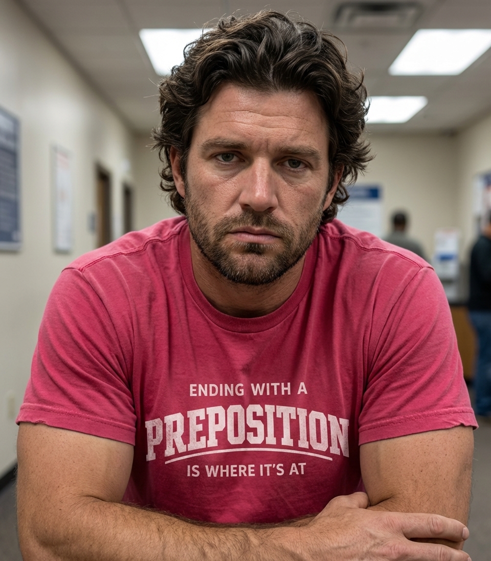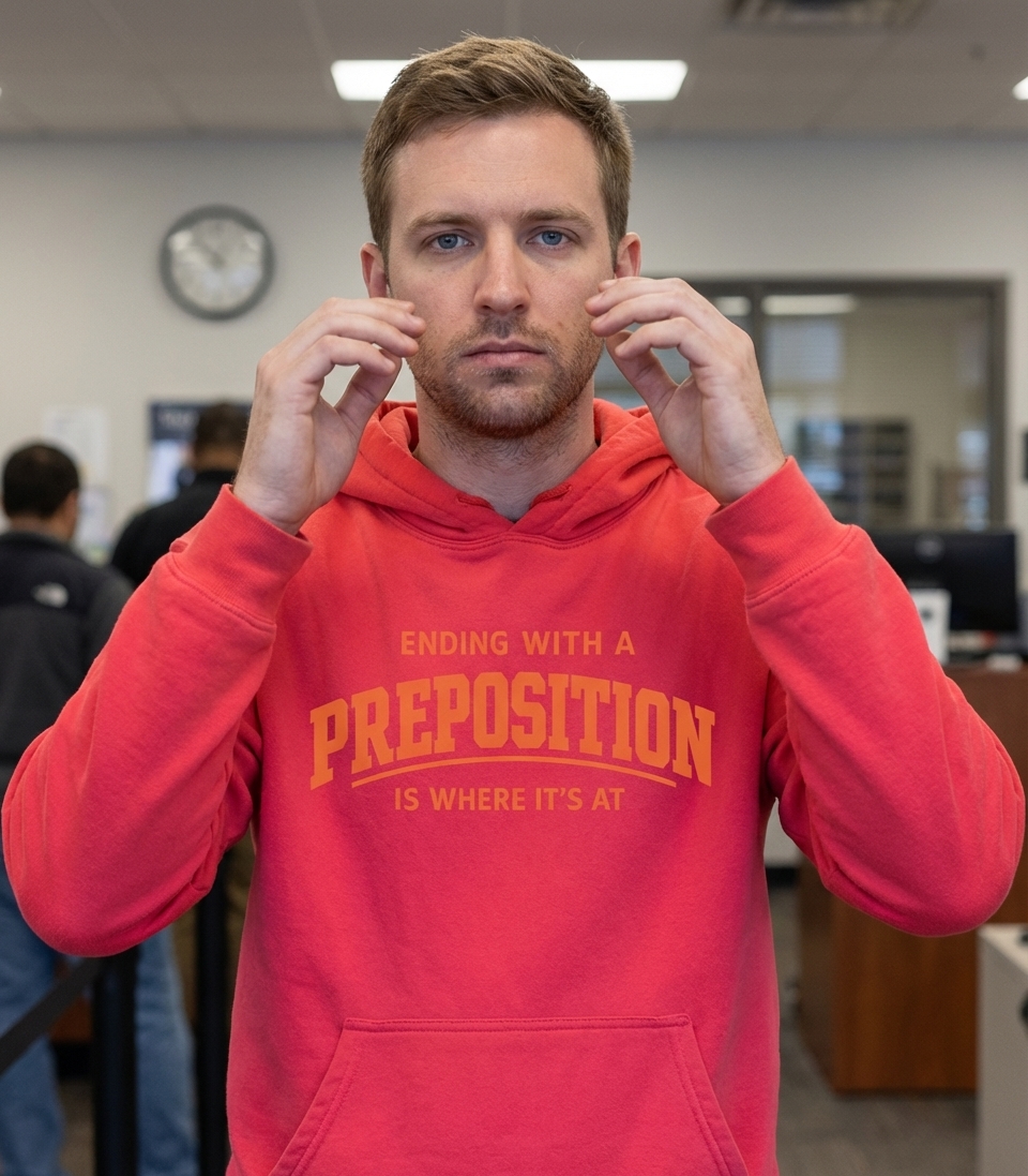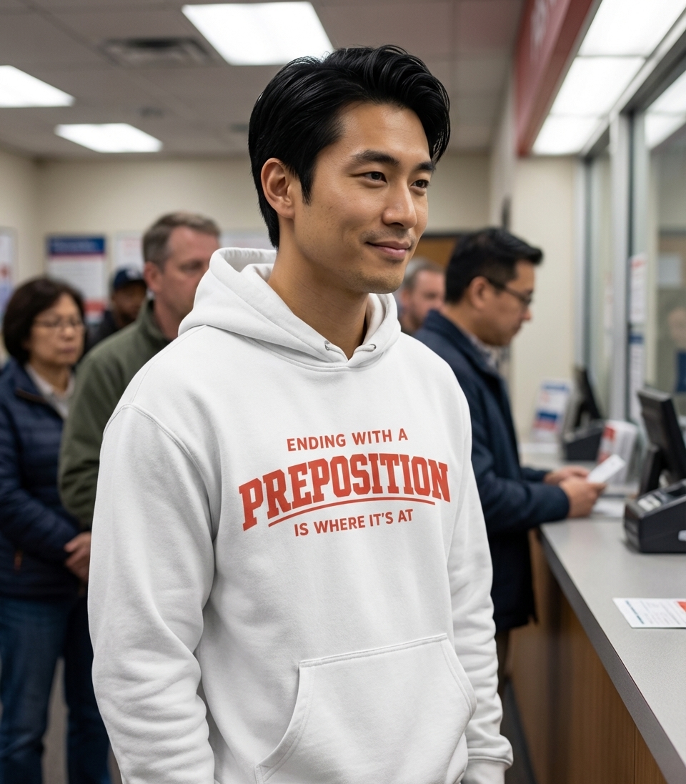 The 'Ending with a Preposition' phrase captures the witty lifestyle of grammar enthusiasts and language rebels who enjoy clever wordplay, modern slang, and playfully defying traditional rules.