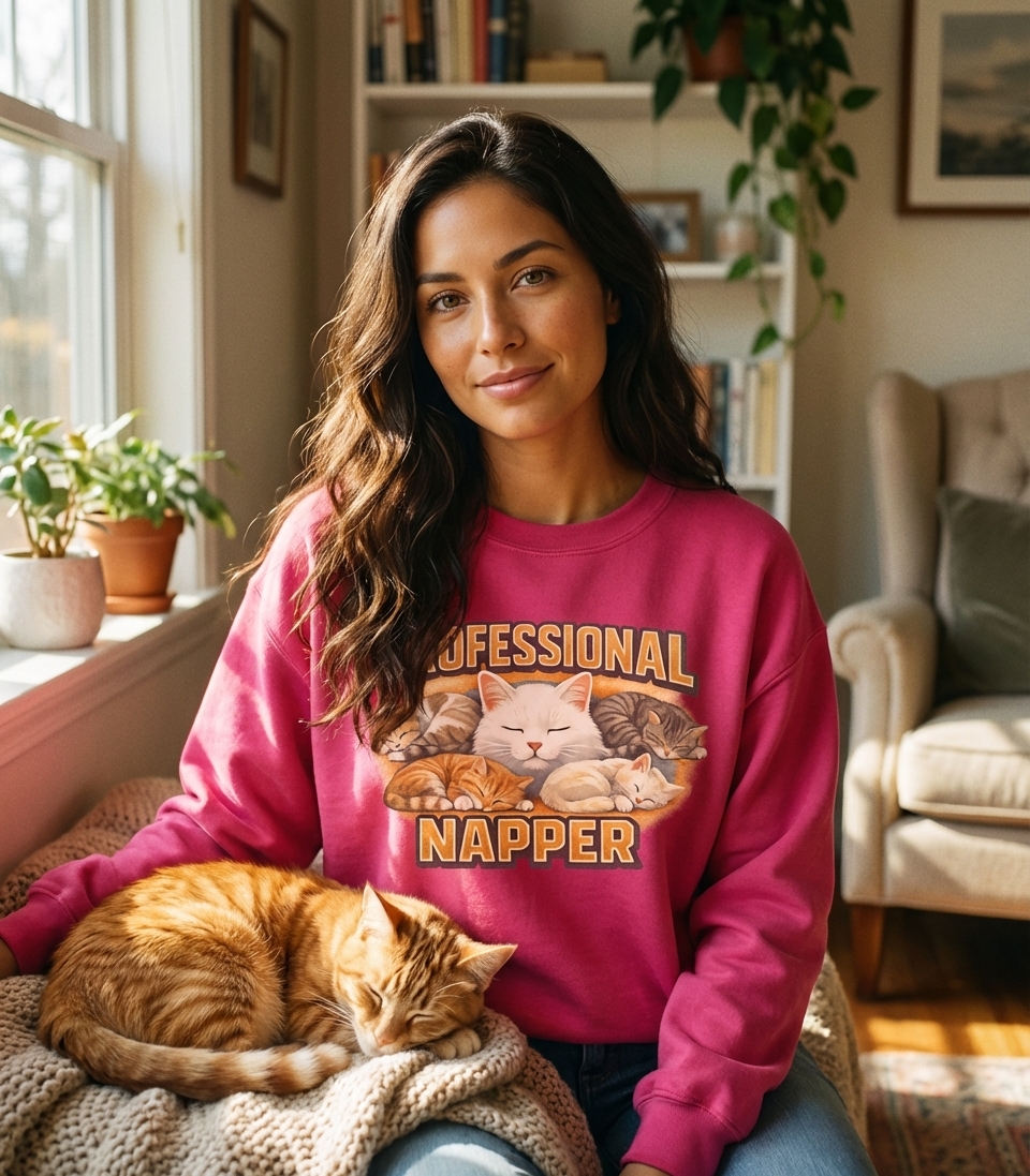 Omg, my "Professional Napper Cats" shirt just arrived and I'm obsessed. the design is so perfectly chill, totally my aesthetic for a relaxed day. Plus, it's actually super comfy!