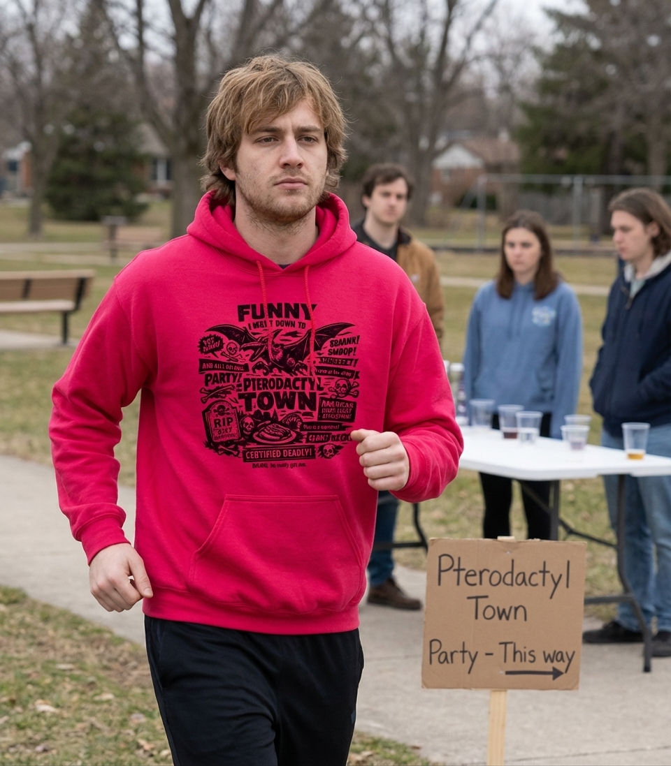 The phrase "Funny! I went down to Party! Pterodactyl Town" sets a whimsical yet foreboding tone. It implies a surprising and wild encounter in a place teeming with ancient, dangerous, and perhaps unexpected fun.