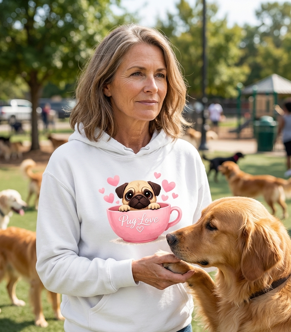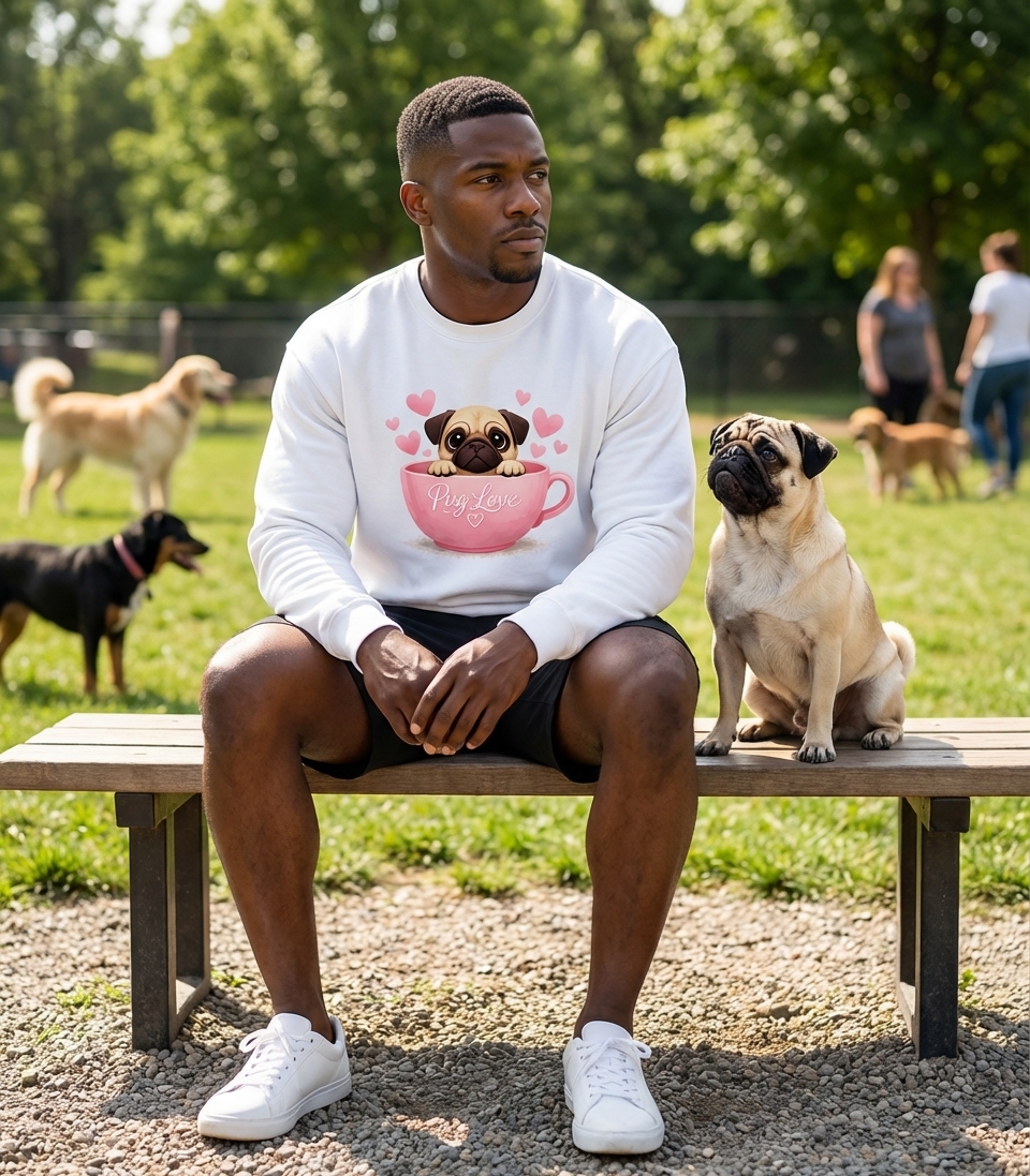 The "Pug Love" design captures the lifestyle of devoted pug parents who cherish their furry companions, enjoy their playful antics, and celebrate their unique charm.