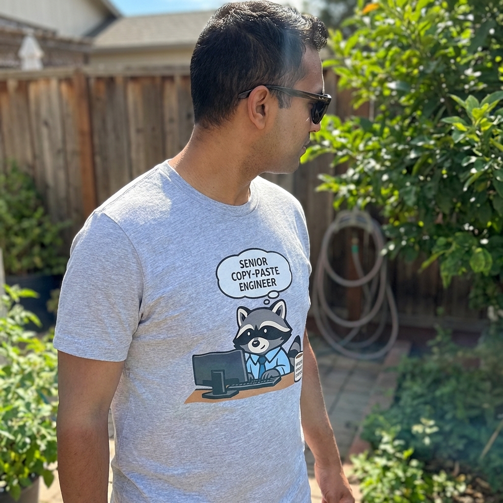 This design features a diligent, yet humorously self-aware, raccoon character at a computer workstation. Dressed in a business casual shirt and tie, the raccoon embodies the spirit of many modern-day office workers in the tech industry. It’s a lighthearted take on the realities of software development and IT.