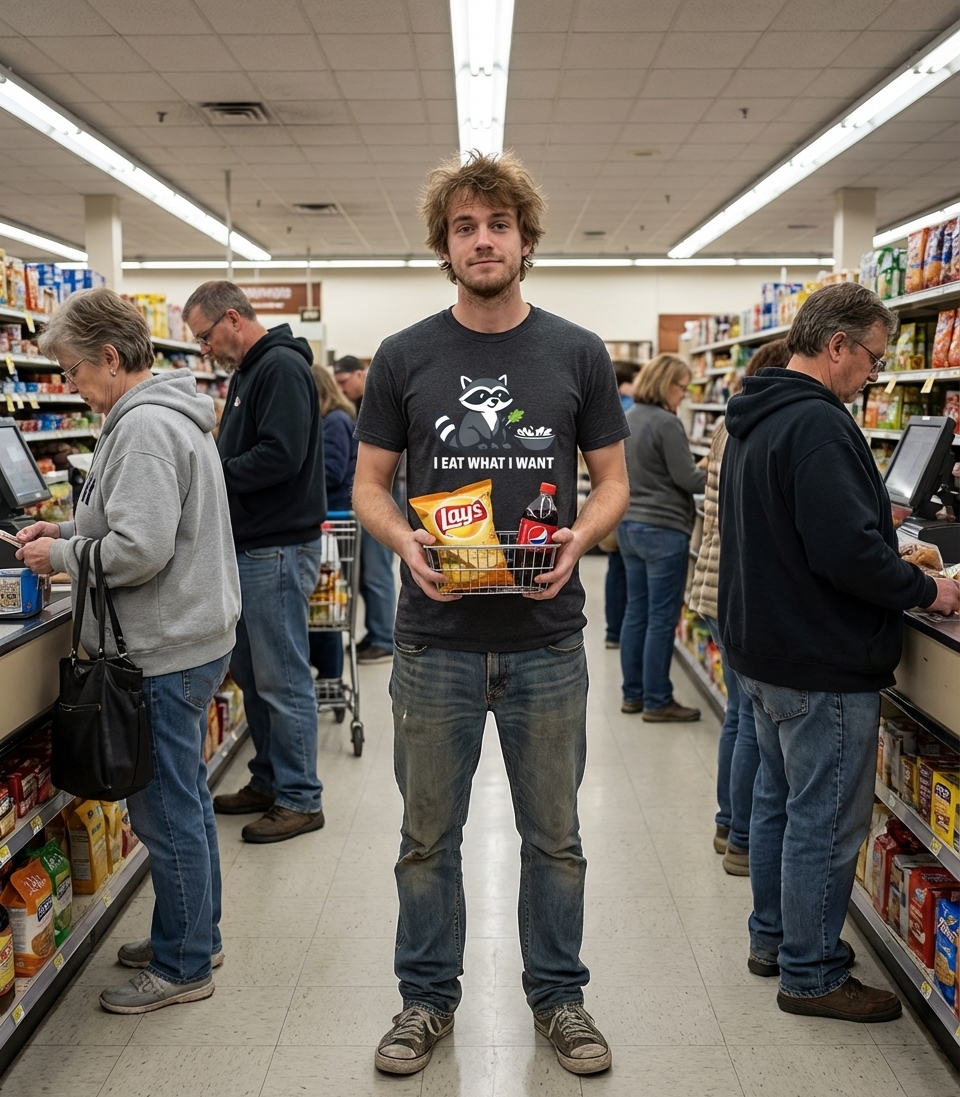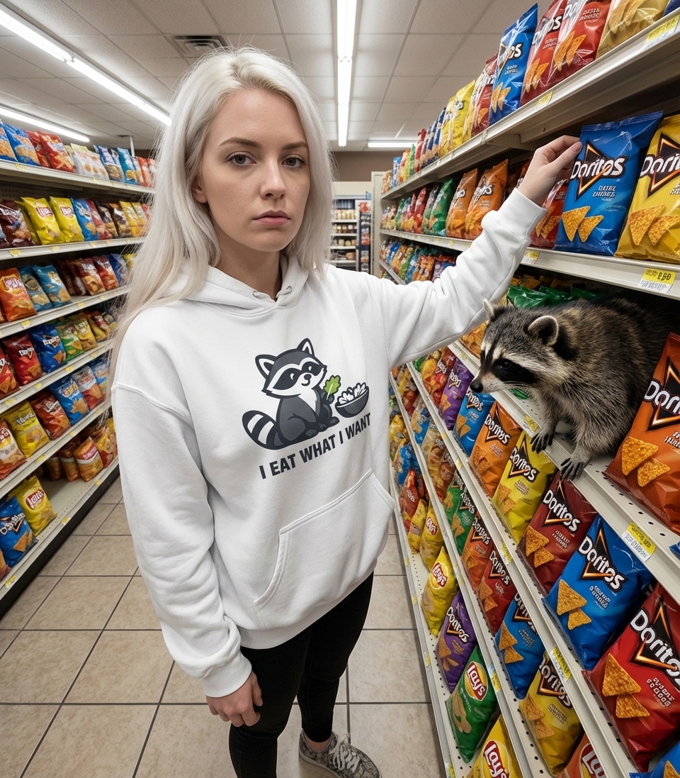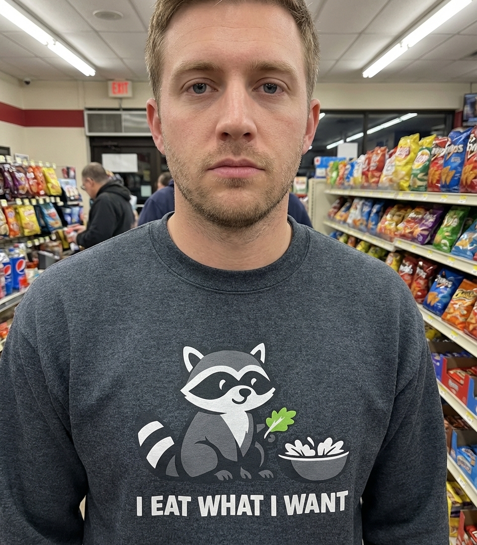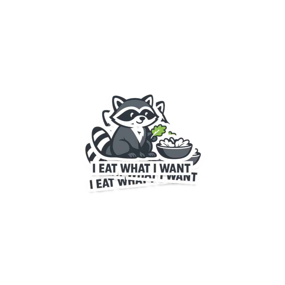 The phrase "I Eat What I Want" embodies a spirit of independence and defiance against strict dietary norms or expectations. When paired with a raccoon eating a salad, it creates a witty, sarcastic commentary on personal food choices.