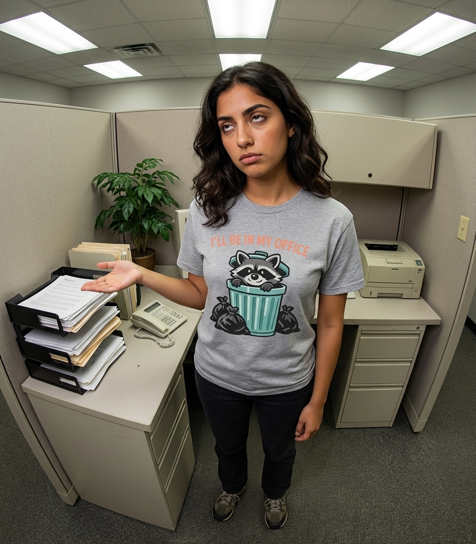 This humorous design features an adorable cartoon raccoon peeking out of a teal trash can, accompanied by black trash bags. The playful text "I'LL BE IN MY OFFICE" is displayed above, creating a whimsical take on everyday work life.