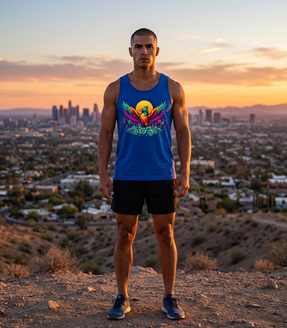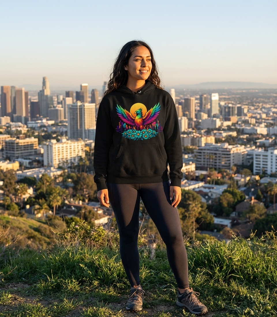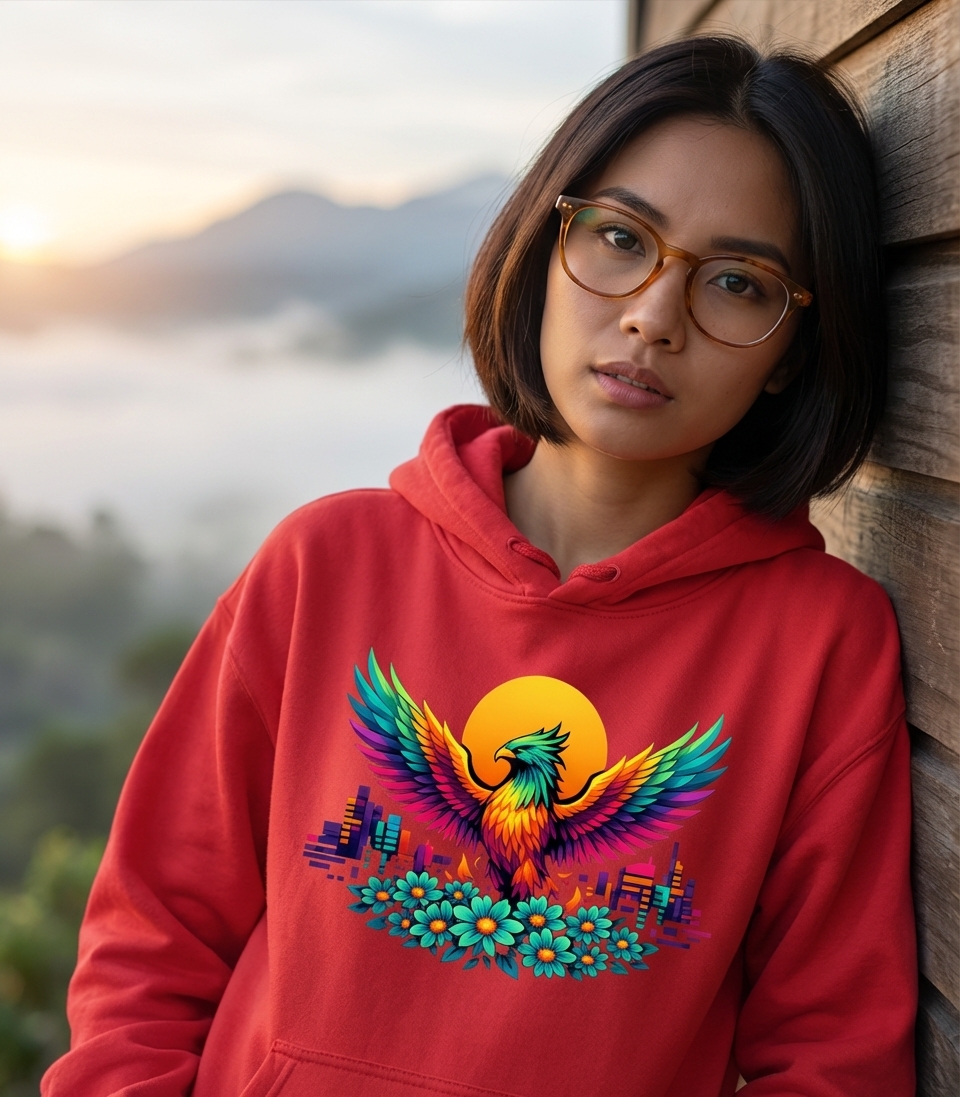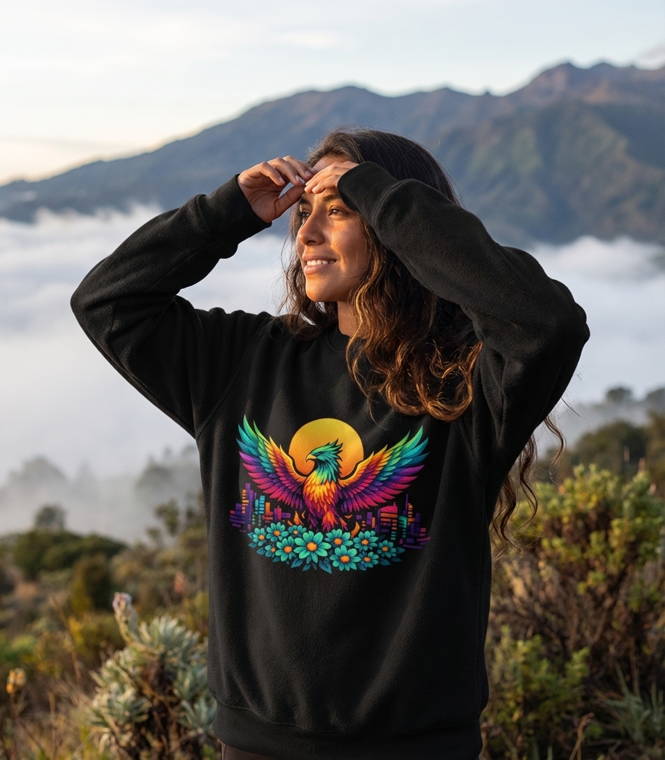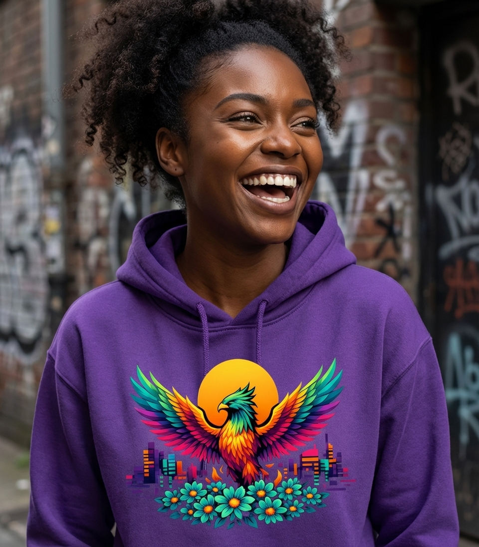 This vibrant phoenix design captures the spirit of renewal, strength, and colorful life for those embracing change and urban magic.