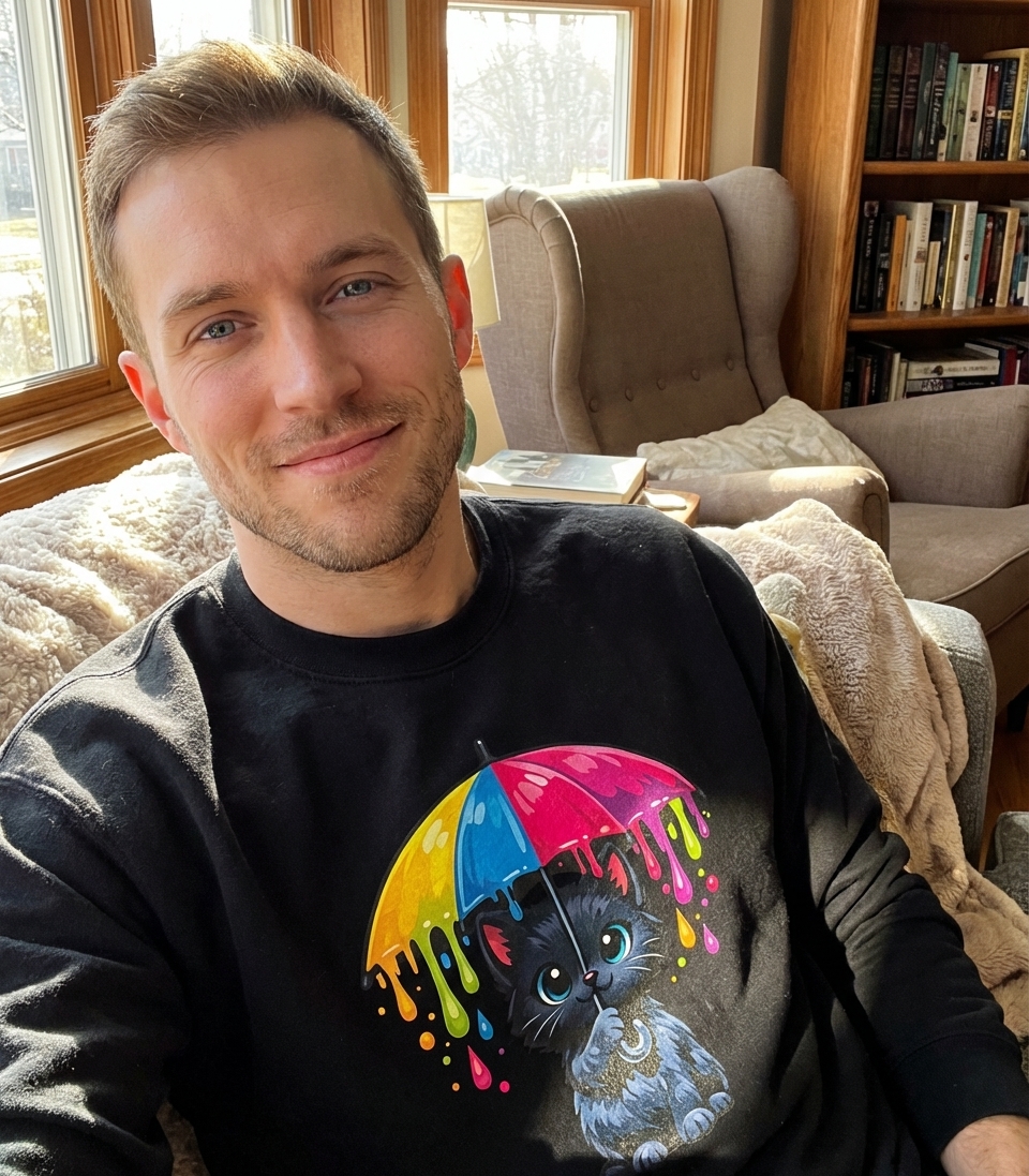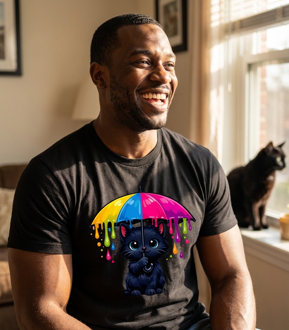 The 'Rainbow Umbrella Cat' design captures the whimsical spirit of cat lovers who enjoy vibrant art, playful themes, and a touch of colorful fantasy in their everyday style.