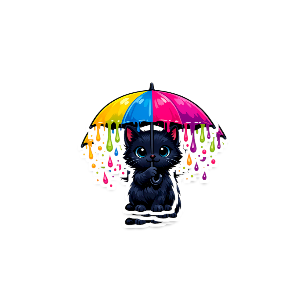 This graphic showcases a fluffy black cat with bright blue eyes, holding a colorful umbrella. Vivid paint drips fall from the umbrella's edges, creating a dynamic and artistic scene. The design blends cuteness with a burst of color against a dark background.