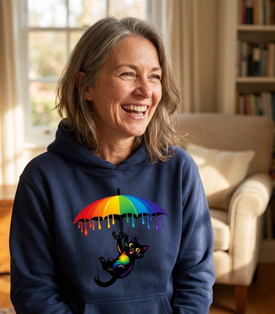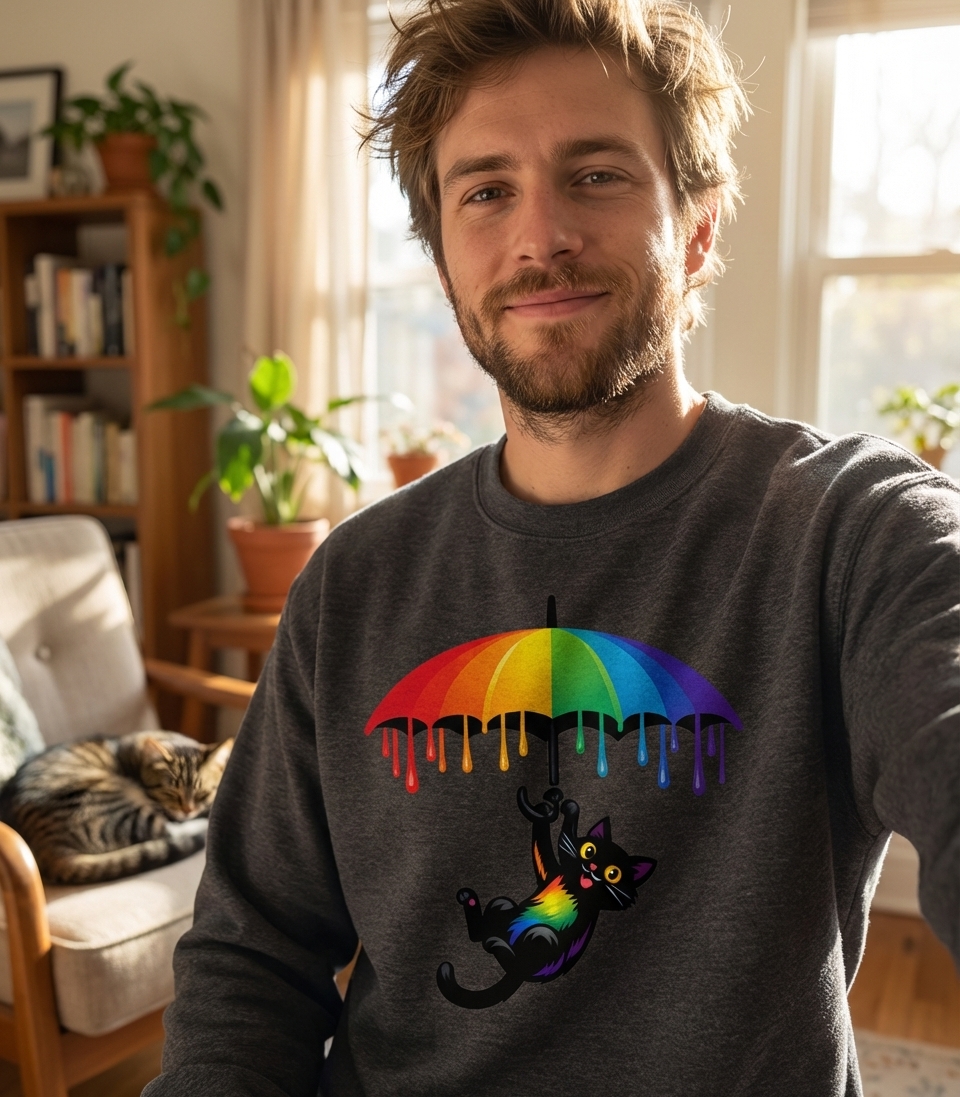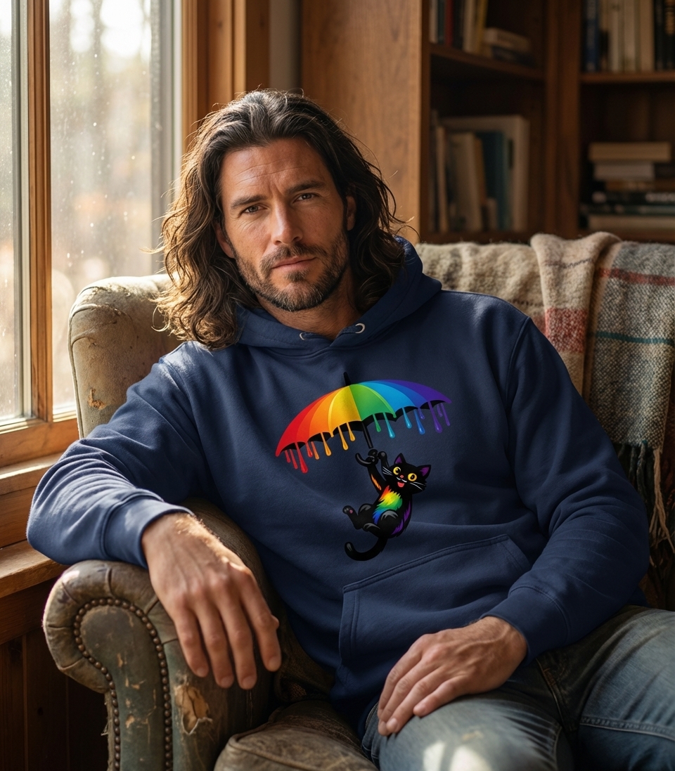 Yes! Check the style selector above to see all available options including hoodies and sweatshirts for the Rainbow Umbrella Cat graphic.