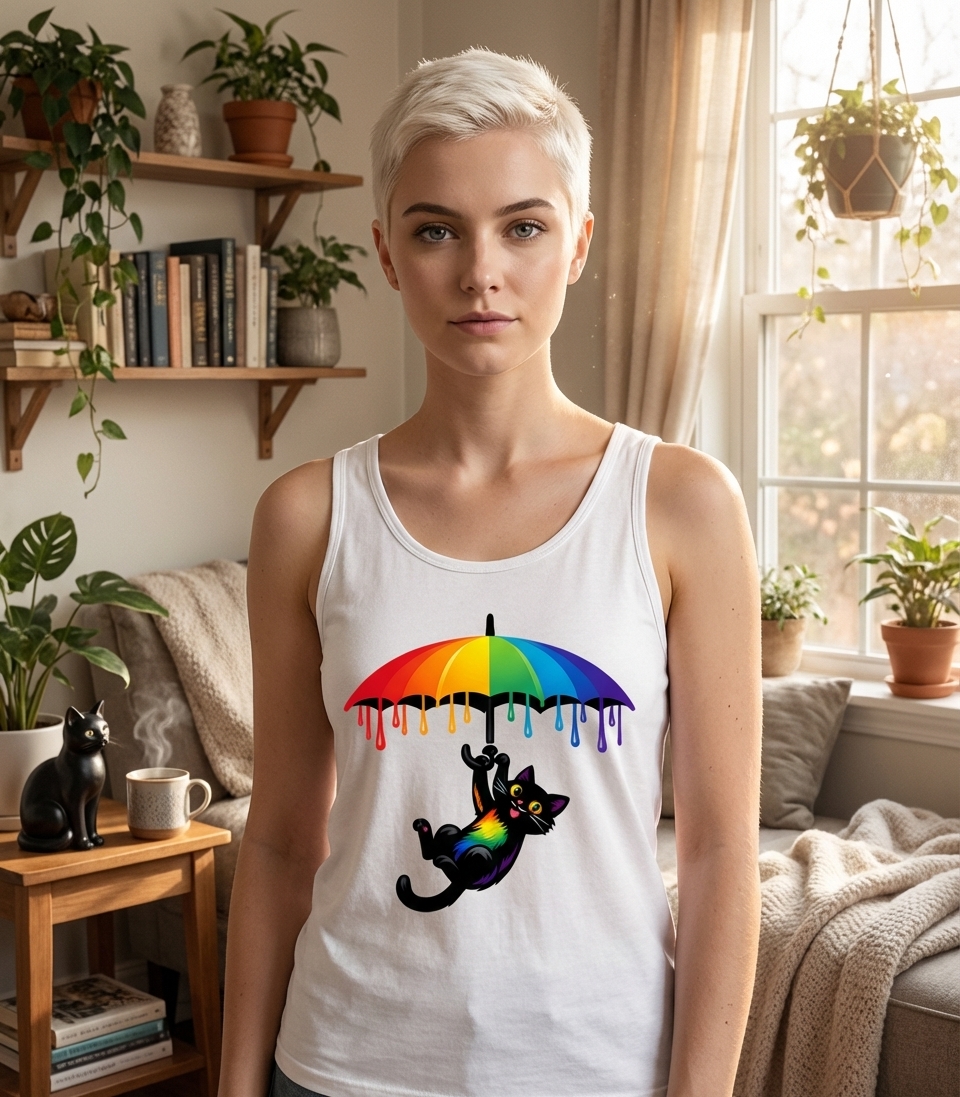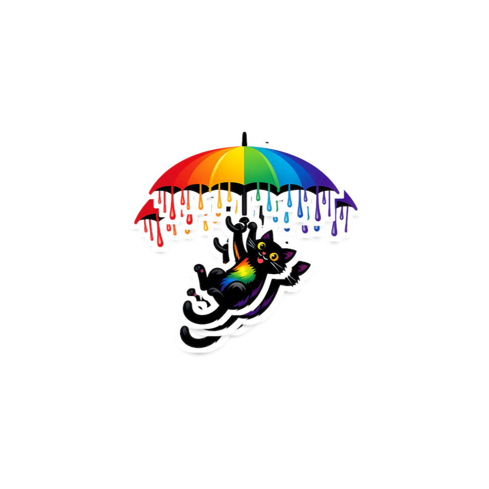 This graphic features a delightful black cat in mid-air, playfully holding onto the handle of a colorful rainbow umbrella. The umbrella appears to be dripping with vibrant, segmented colors, adding a dynamic and whimsical touch to the artwork. The cat itself exhibits a cheerful expression and patches of rainbow-colored fur on its chest, enhancing the theme of joy and diversity.