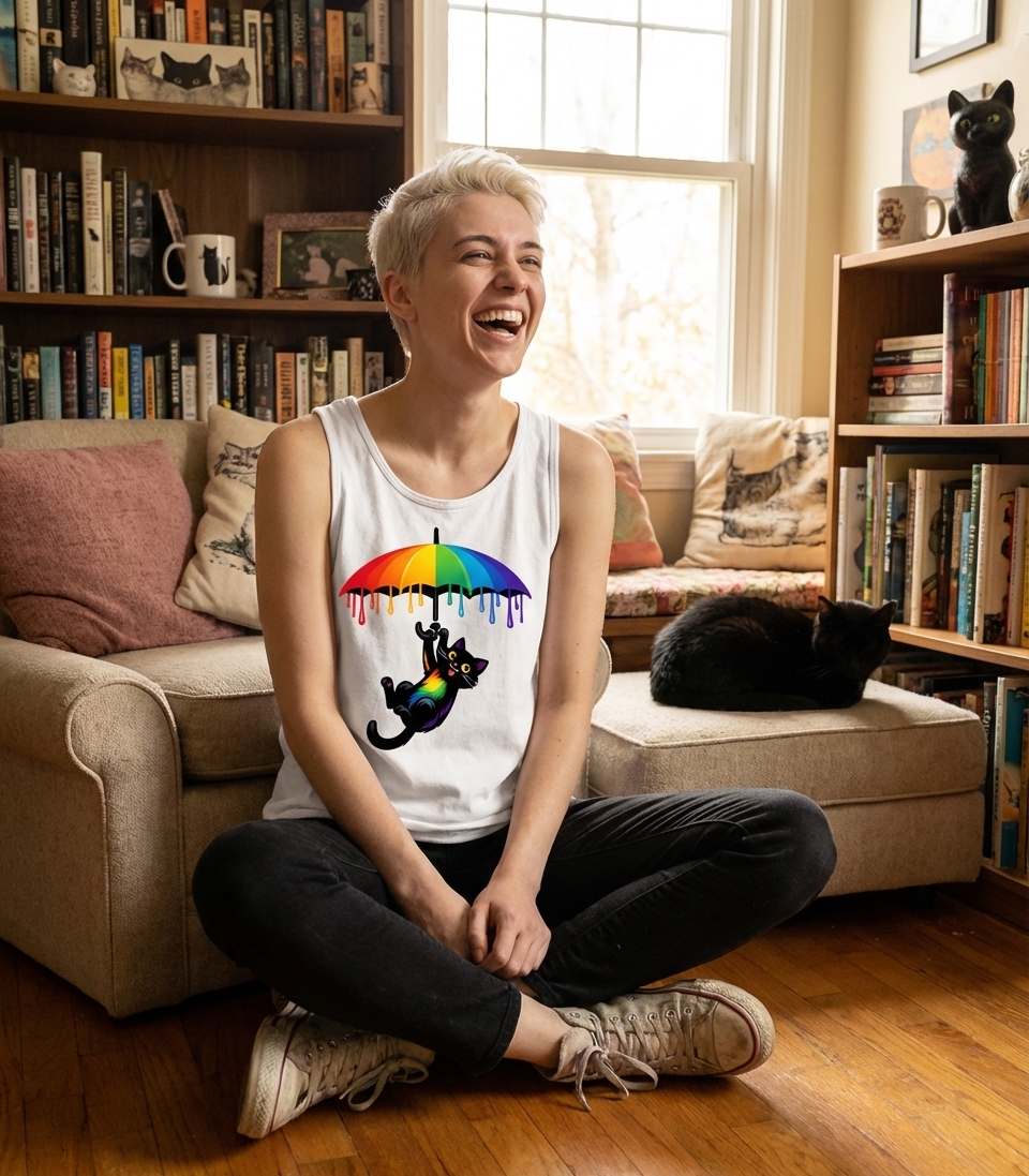 While not a literal phrase, the design communicates a powerful message of joy, freedom, and self-expression. The vibrant rainbow colors symbolize diversity and inclusivity, strongly resonating with LGBTQ+ pride and the celebration of unique identities. The playful cat embodies a carefree spirit and happiness, suggesting a lighthearted approach to embracing one's true colors.