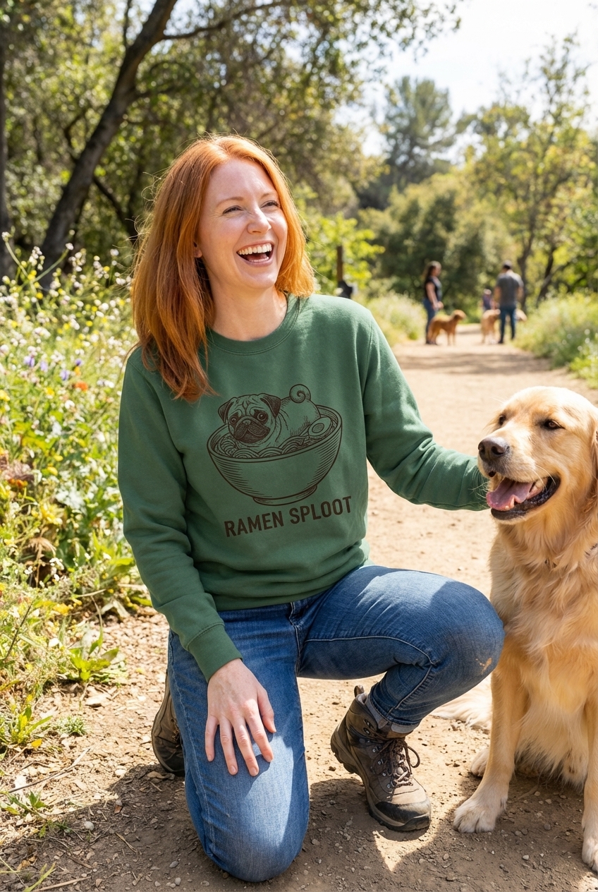 The phrase 'Ramen Sploot' combines the popular Japanese noodle dish, ramen, with 'sploot,' an internet term describing an animal lying flat on its belly with back legs extended. It's a playful nod to both food enthusiasts and dog owners who appreciate humorous pet behavior.