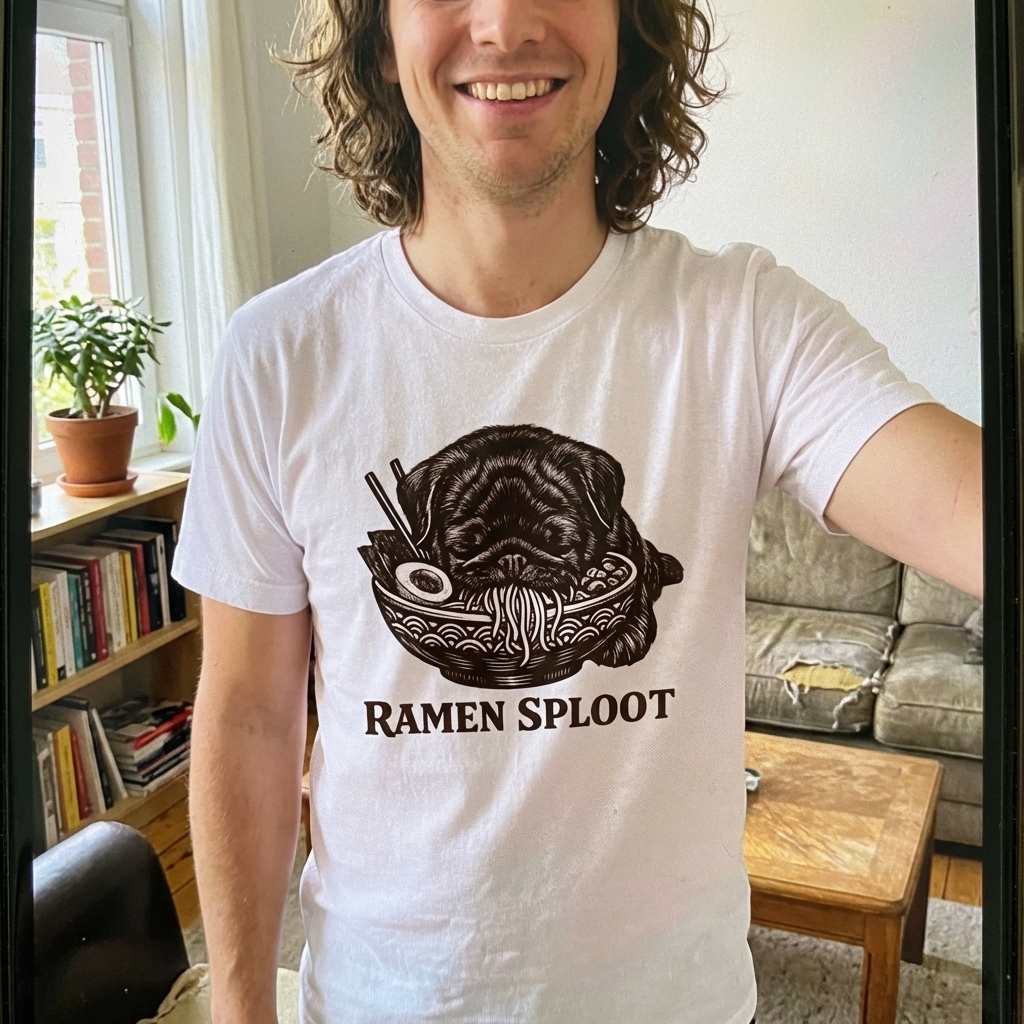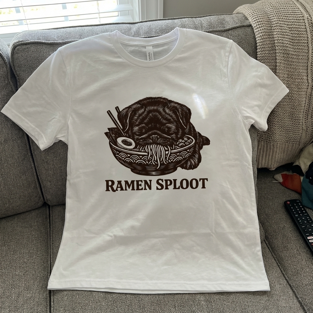 The "Ramen Sploot" design captures the relaxed lifestyle of pug lovers who enjoy cozy nights, delicious noodles, and adorable dog antics.