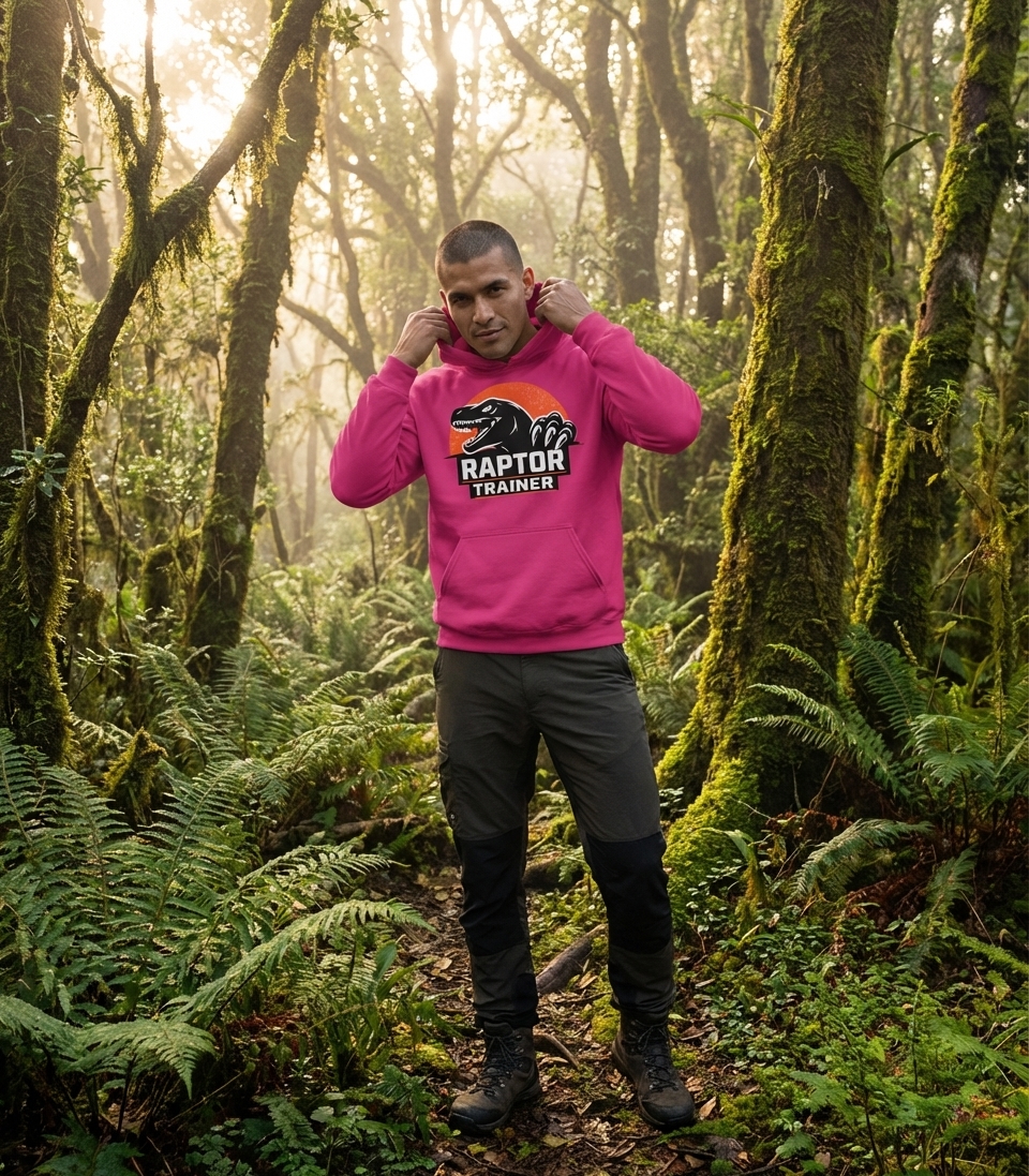 The 'Raptor Trainer' design captures the imaginative lifestyle of dinosaur enthusiasts who dream of taming powerful prehistoric creatures.