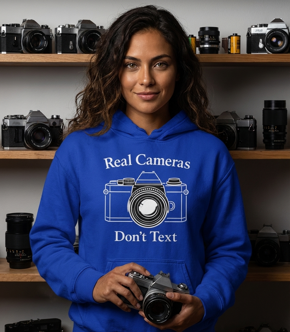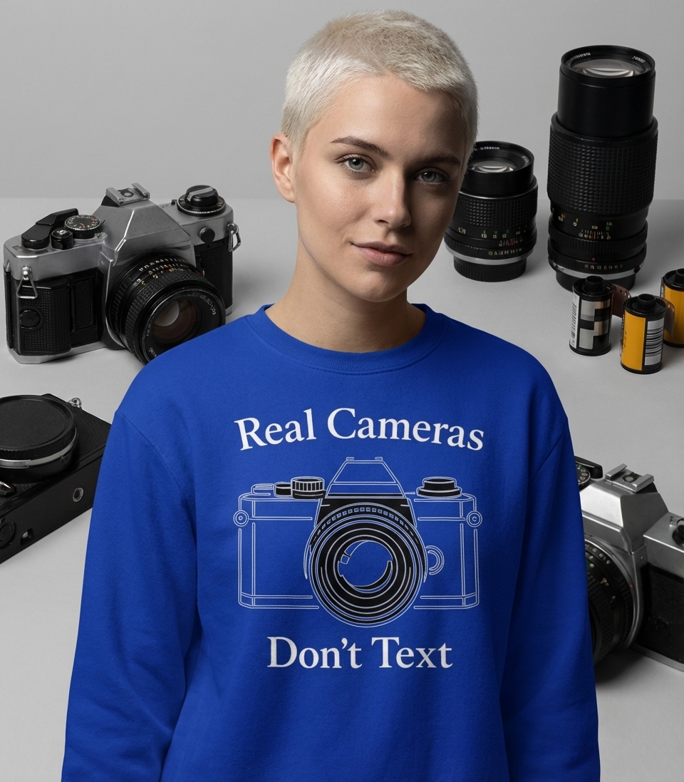 The 'Real Cameras Don't Text' phrase captures the lifestyle of passionate photographers who spend their days capturing moments, composing shots, and appreciating dedicated camera gear.