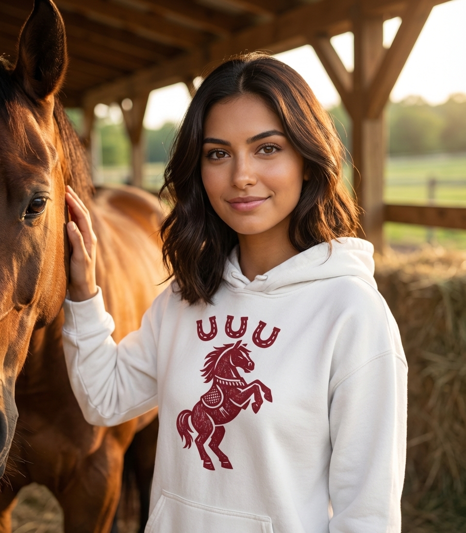 This striking design featuring a rearing horse and lucky horseshoes captures the bold spirit of equestrians, horse lovers, and those who appreciate rustic, symbolic art.