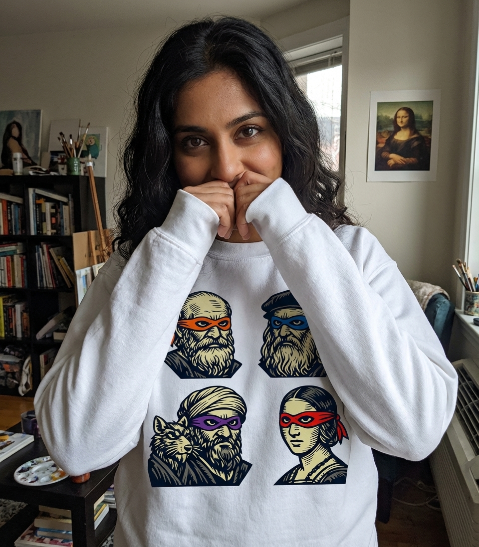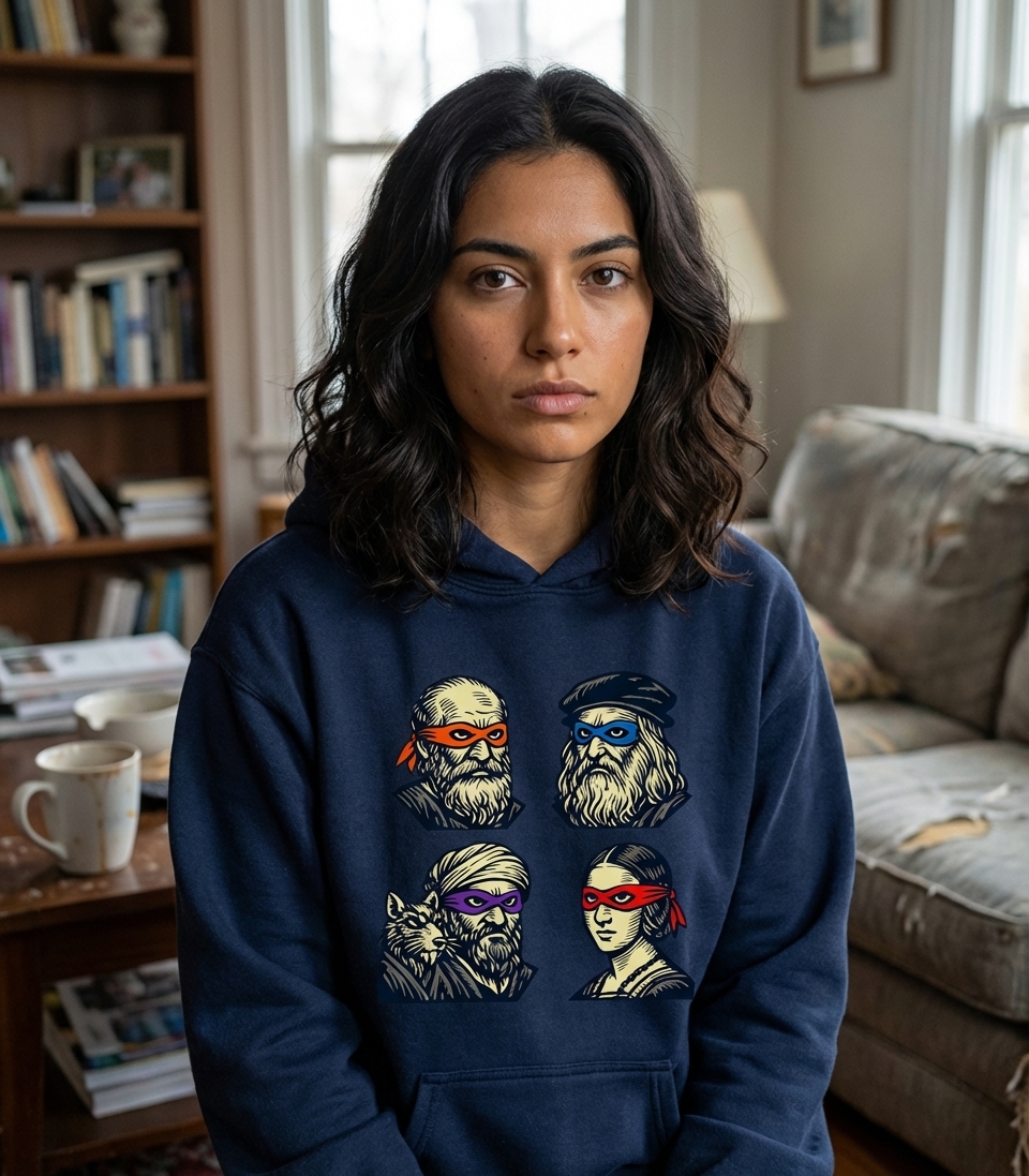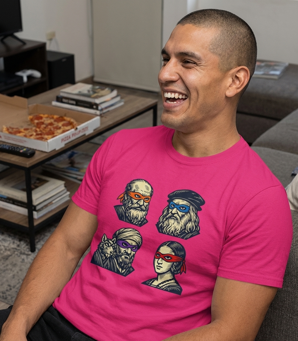 This unique t-shirt design presents a witty mashup, transforming iconic figures from the Renaissance and classical philosophy into masked vigilantes. Each character sports a distinctive colored bandana, playfully nodding to beloved pop culture heroes.