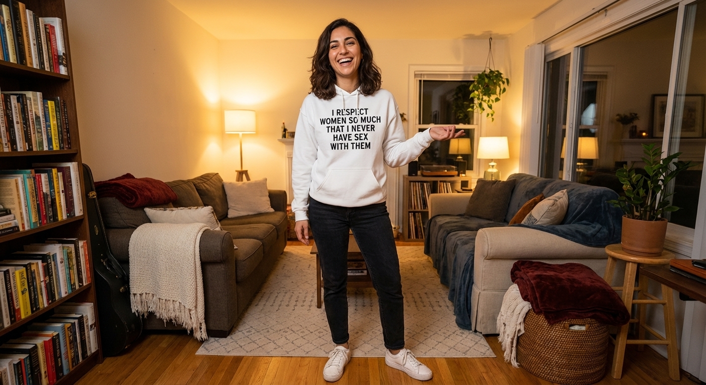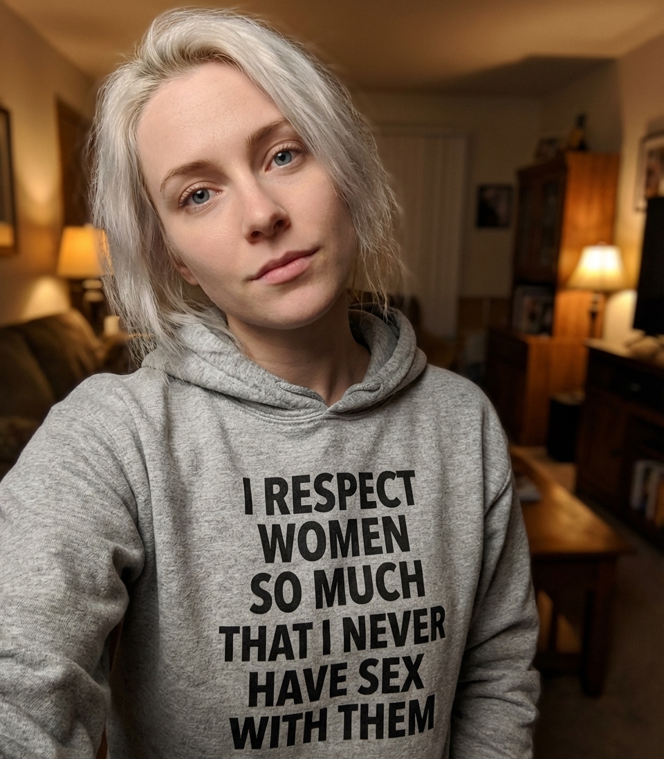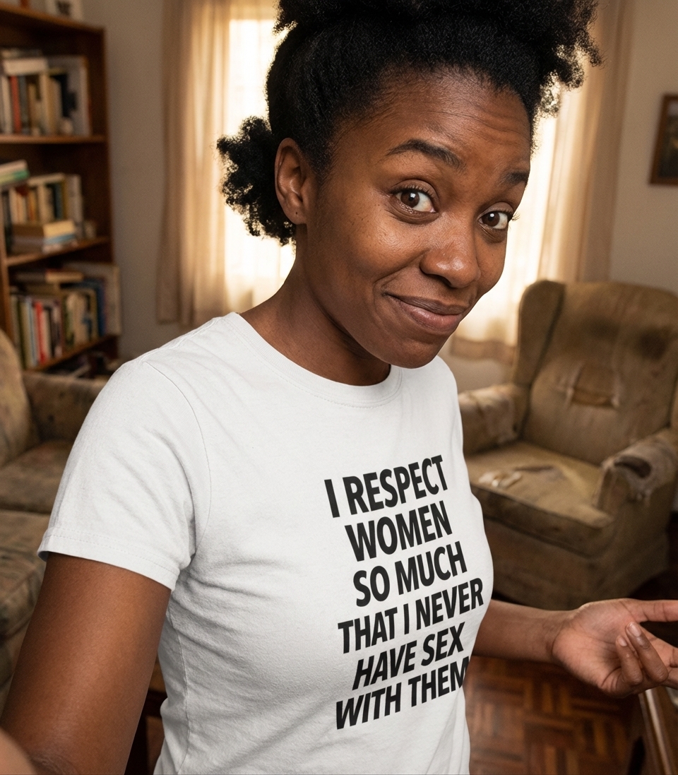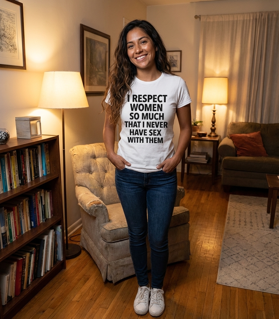 The phrase "I Respect Women So Much That I Never Have Sex With Them" is a self-deprecating, ironic joke. It uses exaggerated politeness to humorously highlight a lack of romantic or sexual experience.