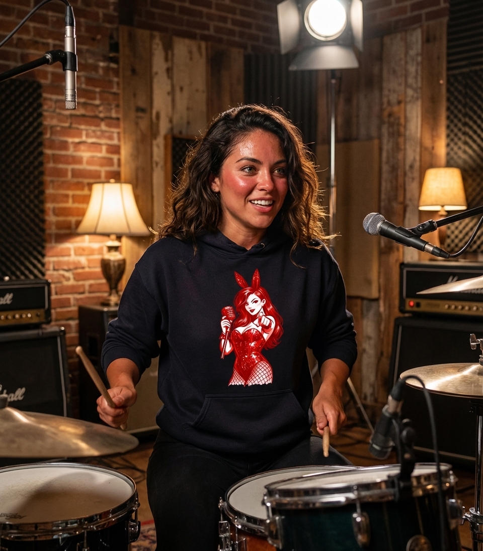 This artwork features a striking illustration of a woman in a retro-inspired bunny costume, complete with sparkling bunny ears and a glittery red outfit. She holds a vintage microphone and points forward with a confident, engaging expression, set against a classic black background.
