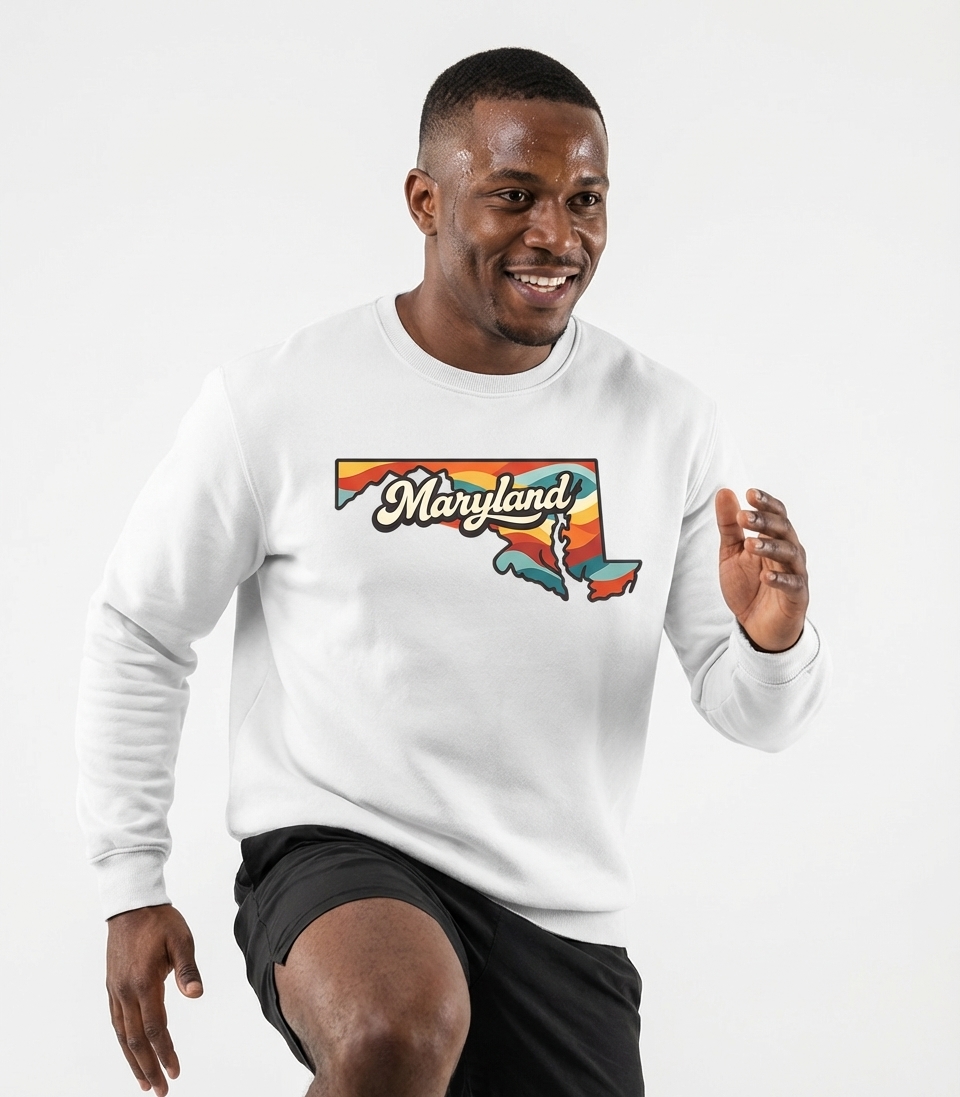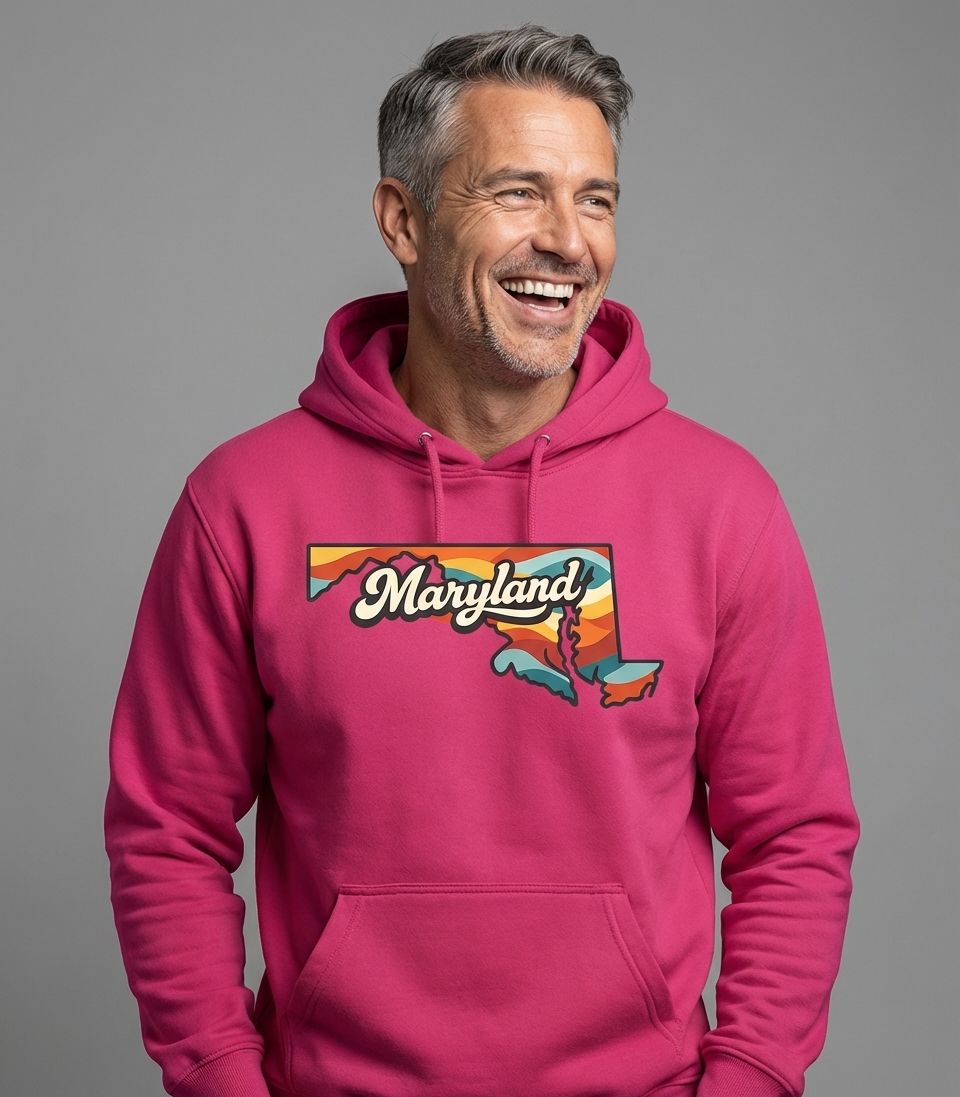 The word "Maryland" centrally placed within the state's silhouette signifies deep-rooted state pride and a strong connection to one's home state. It represents a celebration of Maryland's unique geography, culture, and history, appealing to those who cherish their regional identity.