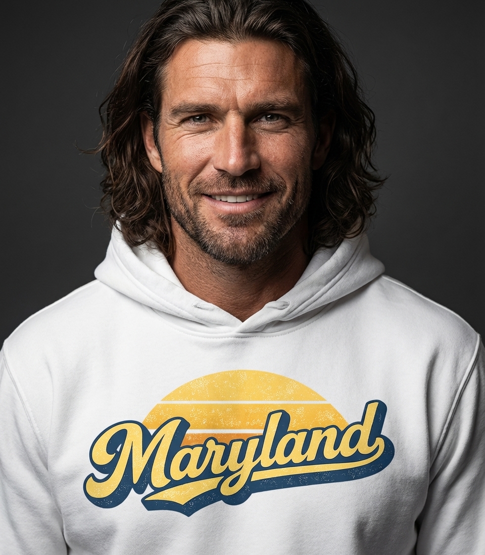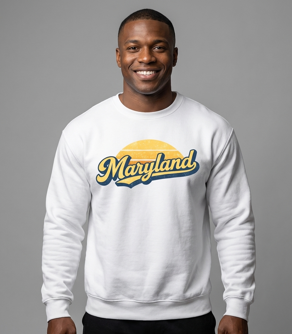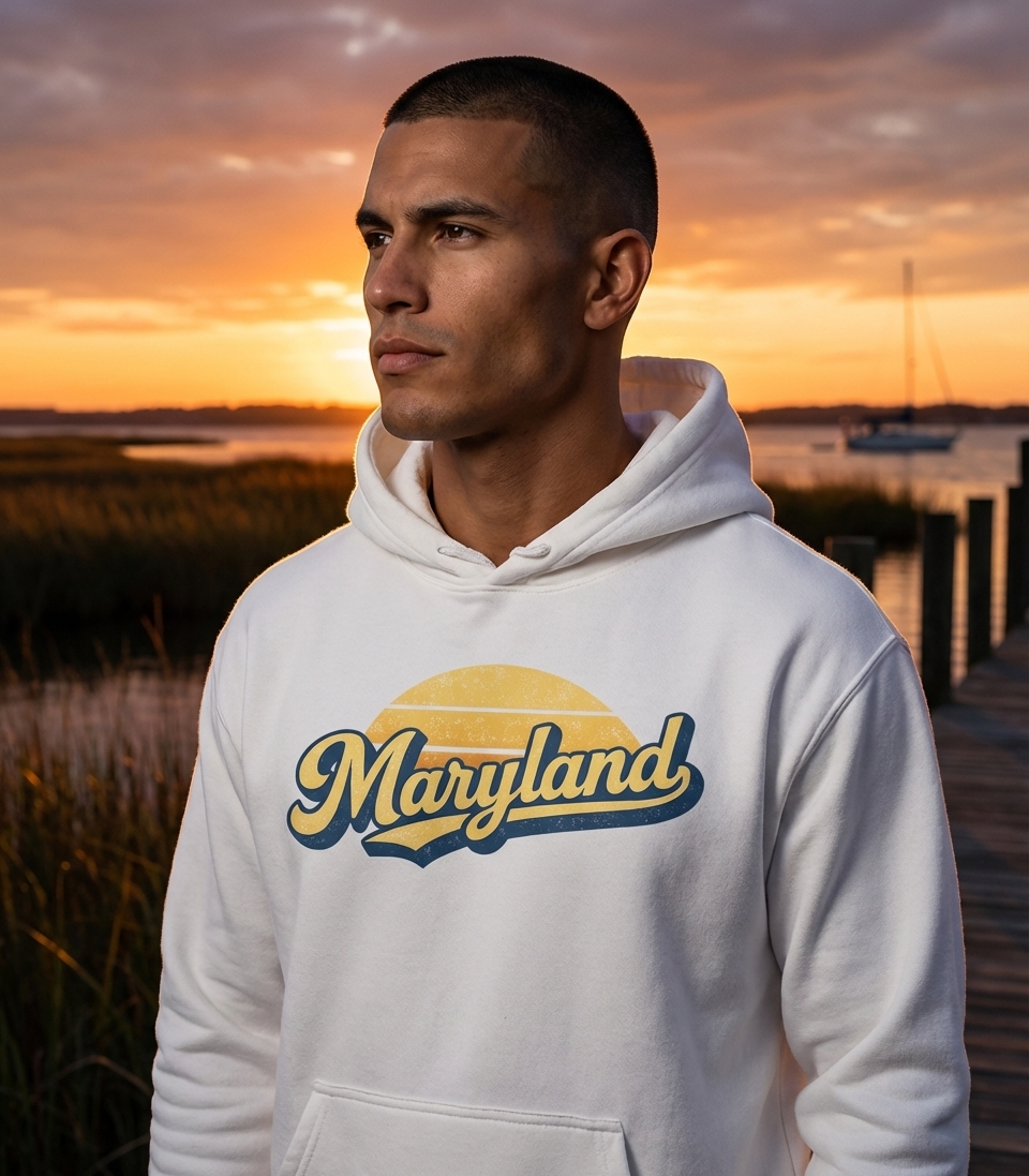 The "Maryland" graphic captures the spirit of residents who love their state, appreciate vintage aesthetics, and proudly represent their home.