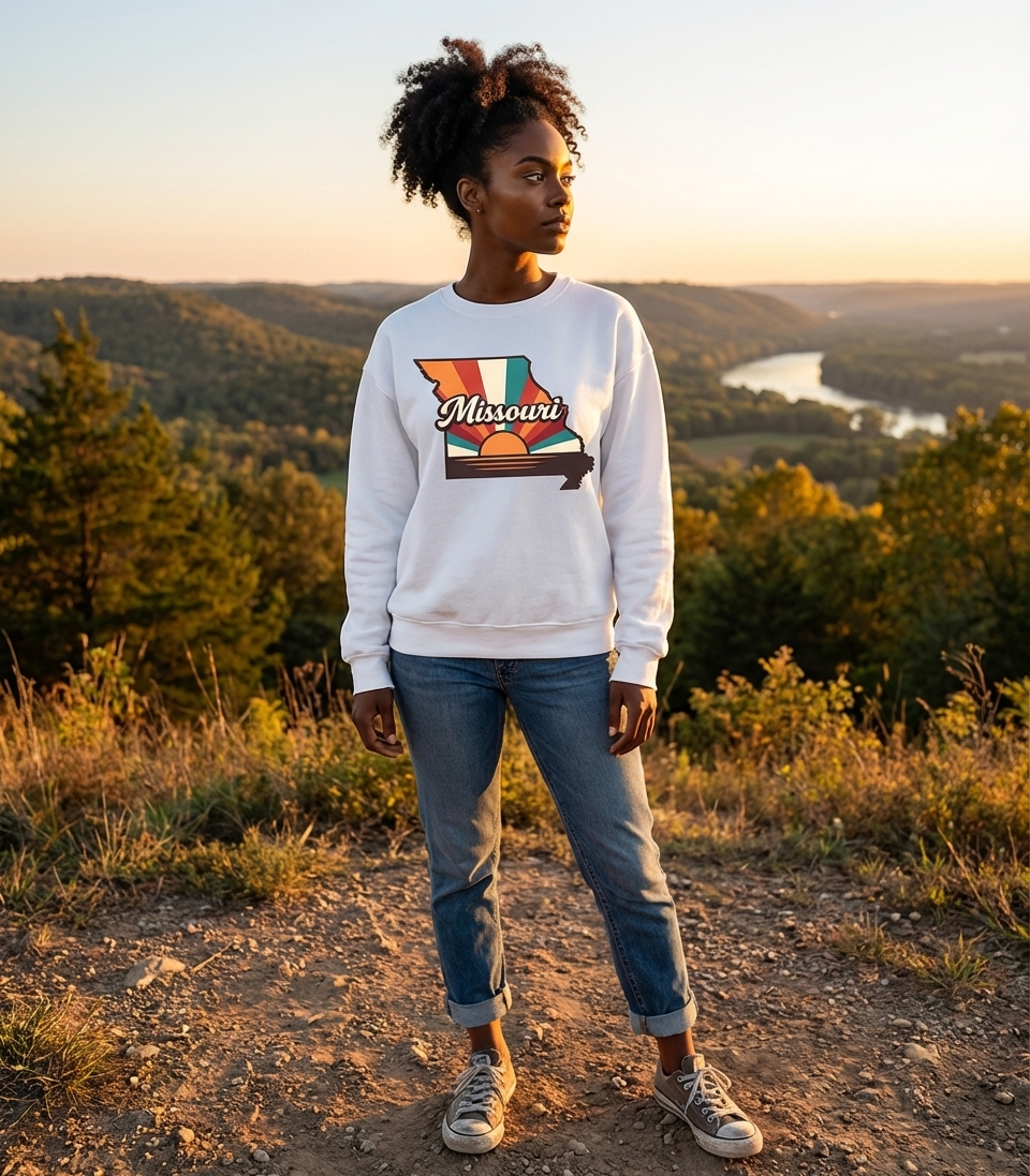 The 'Missouri State Sunset' design captures the lifestyle of proud Missourians who love their home state, its scenic beauty, and unique character.