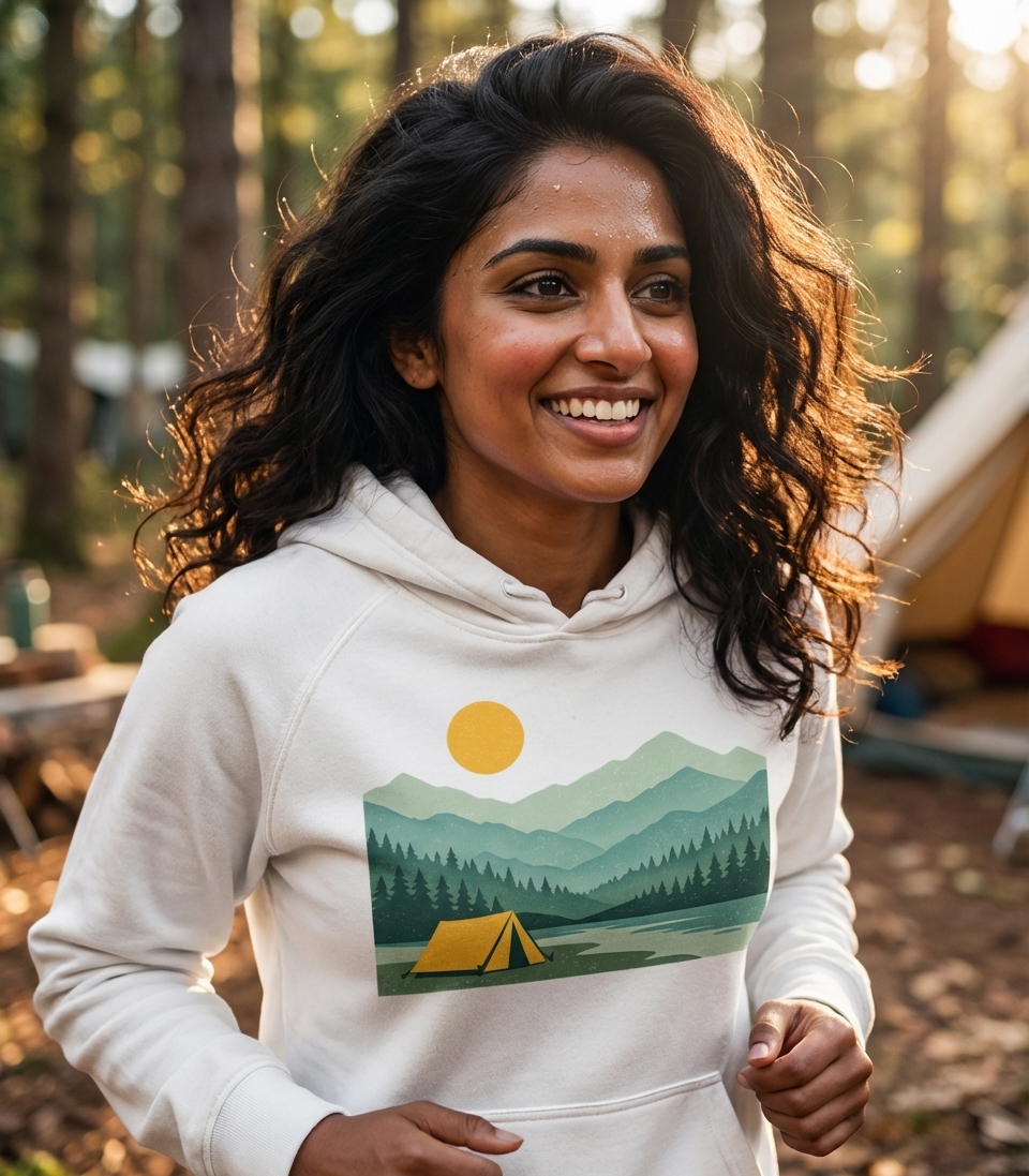 This design captures the serene lifestyle of passionate campers who love exploring mountain wilderness, pitching tents by tranquil lakes, and soaking in the peaceful night sky.