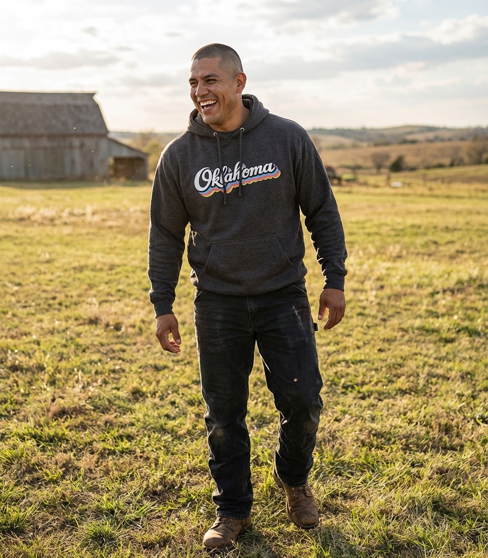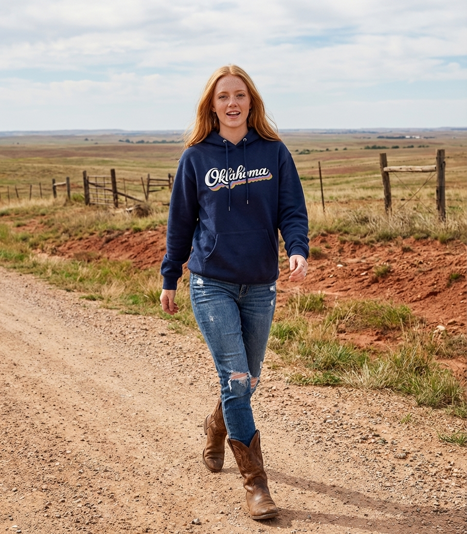 The "Oklahoma" phrase captures the lifestyle of passionate residents who love their home state, embrace its unique culture, and celebrate its history with a touch of retro style.