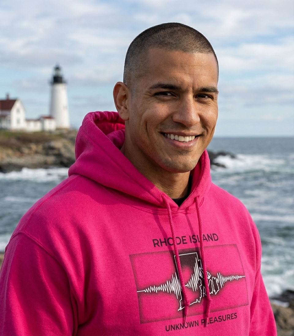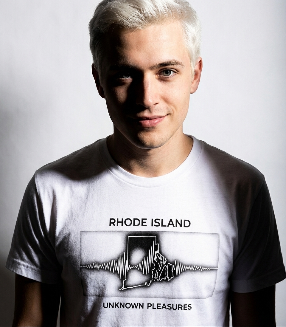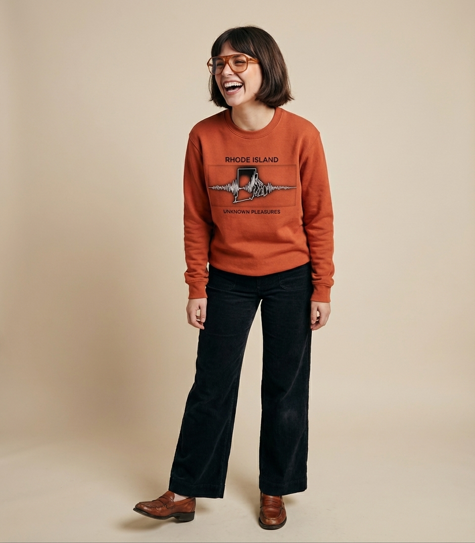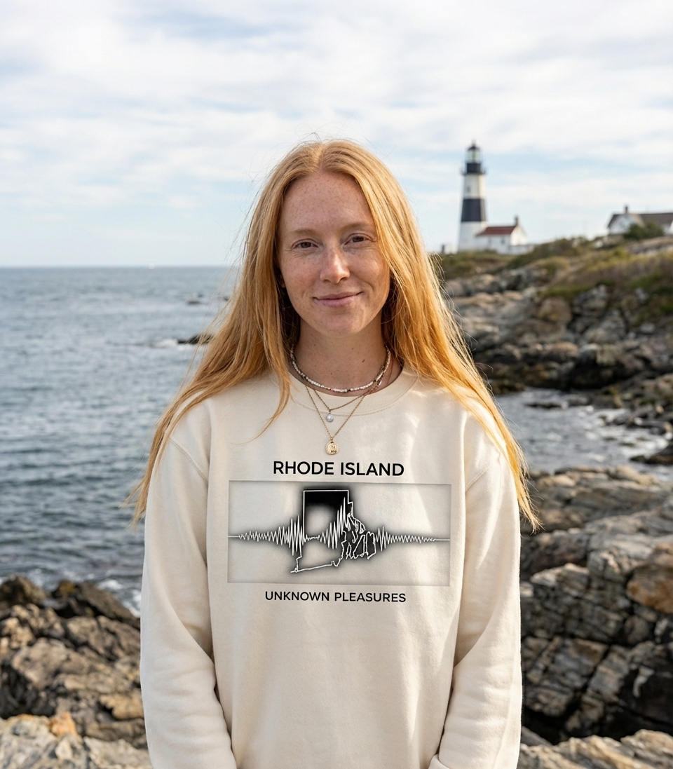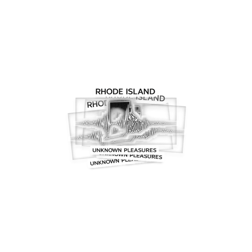 The phrase "RHODE ISLAND" clearly identifies the New England state. "UNKNOWN PLEASURES" is a direct reference to the title of a critically acclaimed and influential post-punk album, renowned for its iconic cover art featuring a similar waveform graphic.