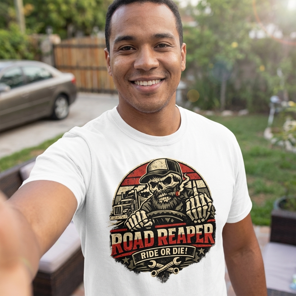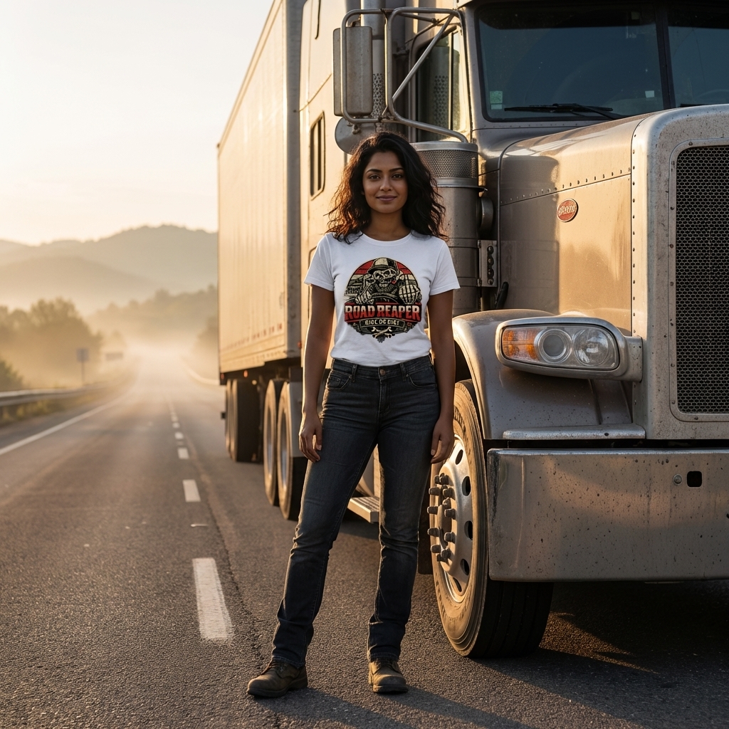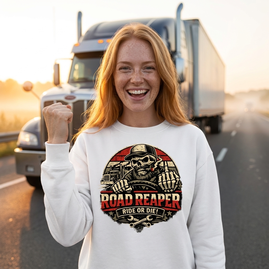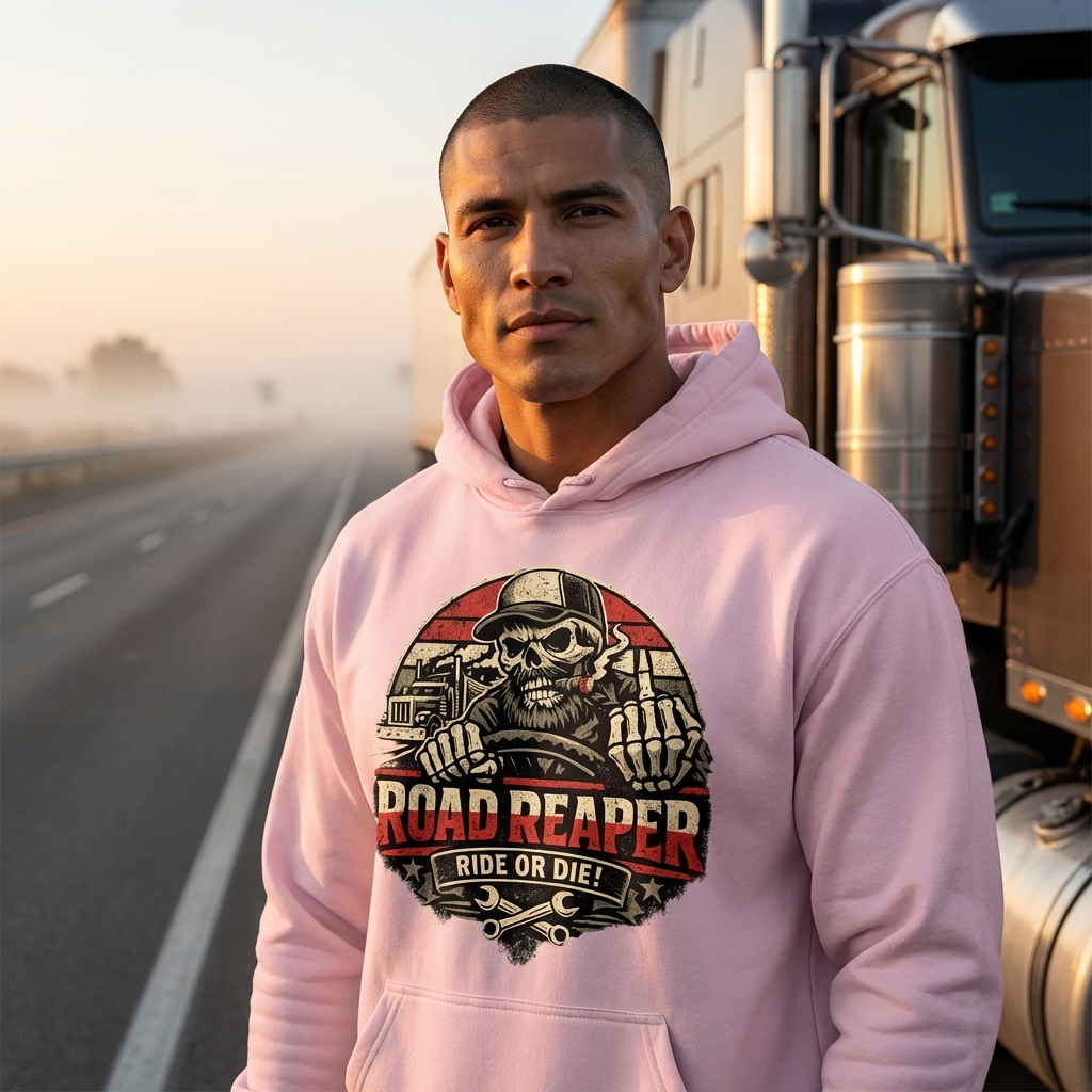 The 'Road Reaper' design captures the lifestyle of passionate truck drivers who navigate long hauls, embrace the open road, and live by a tough, independent code.