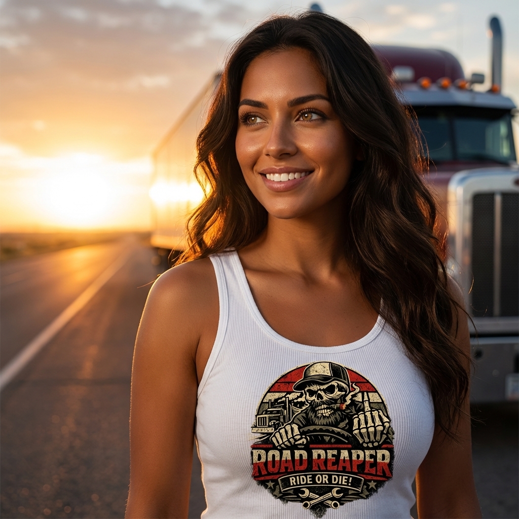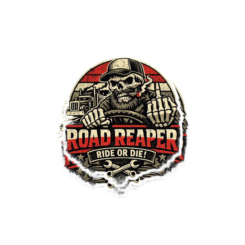 The phrase 'ROAD REAPER' symbolizes a formidable and unwavering presence on the road, akin to a grim reaper who dominates the asphalt. 'RIDE OR DIE!' conveys an ultimate commitment and loyalty to the trucking lifestyle, signifying a dedication that pushes through any challenge. Together, they represent a tough, independent, and unyielding attitude.
