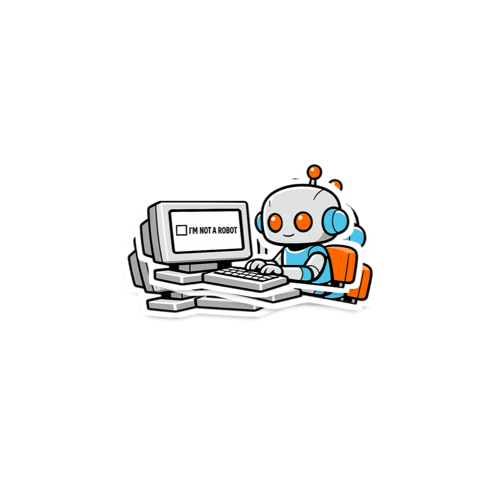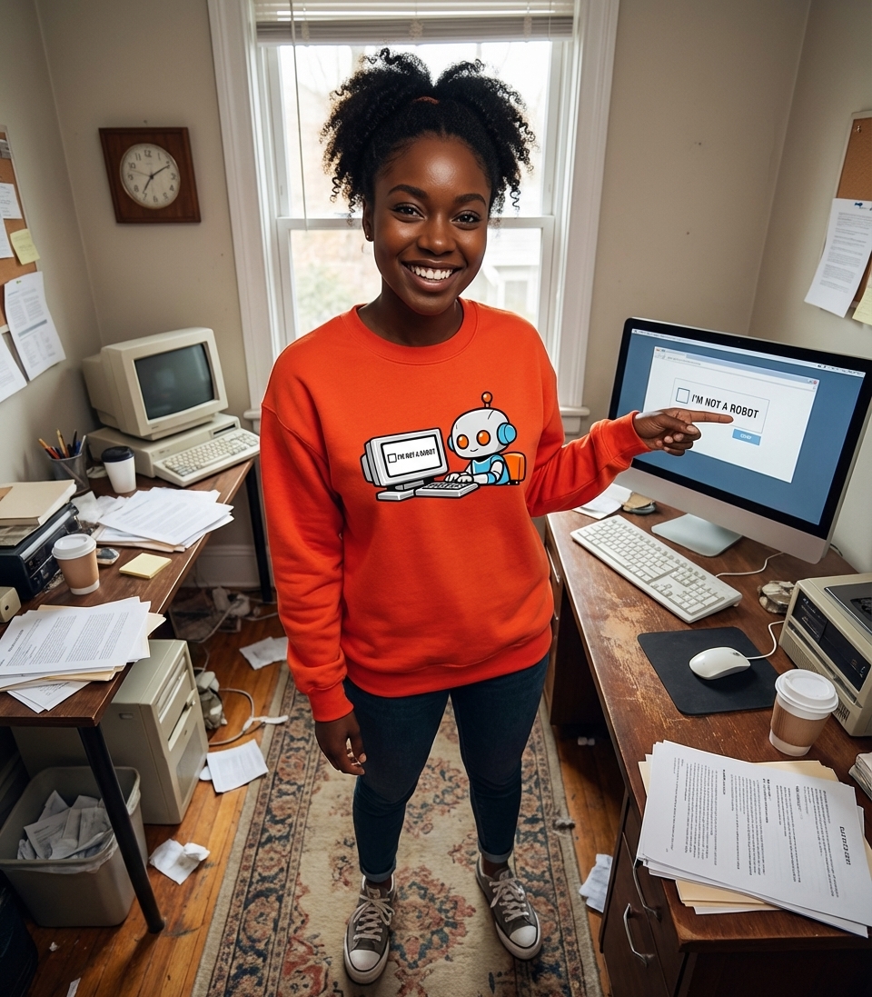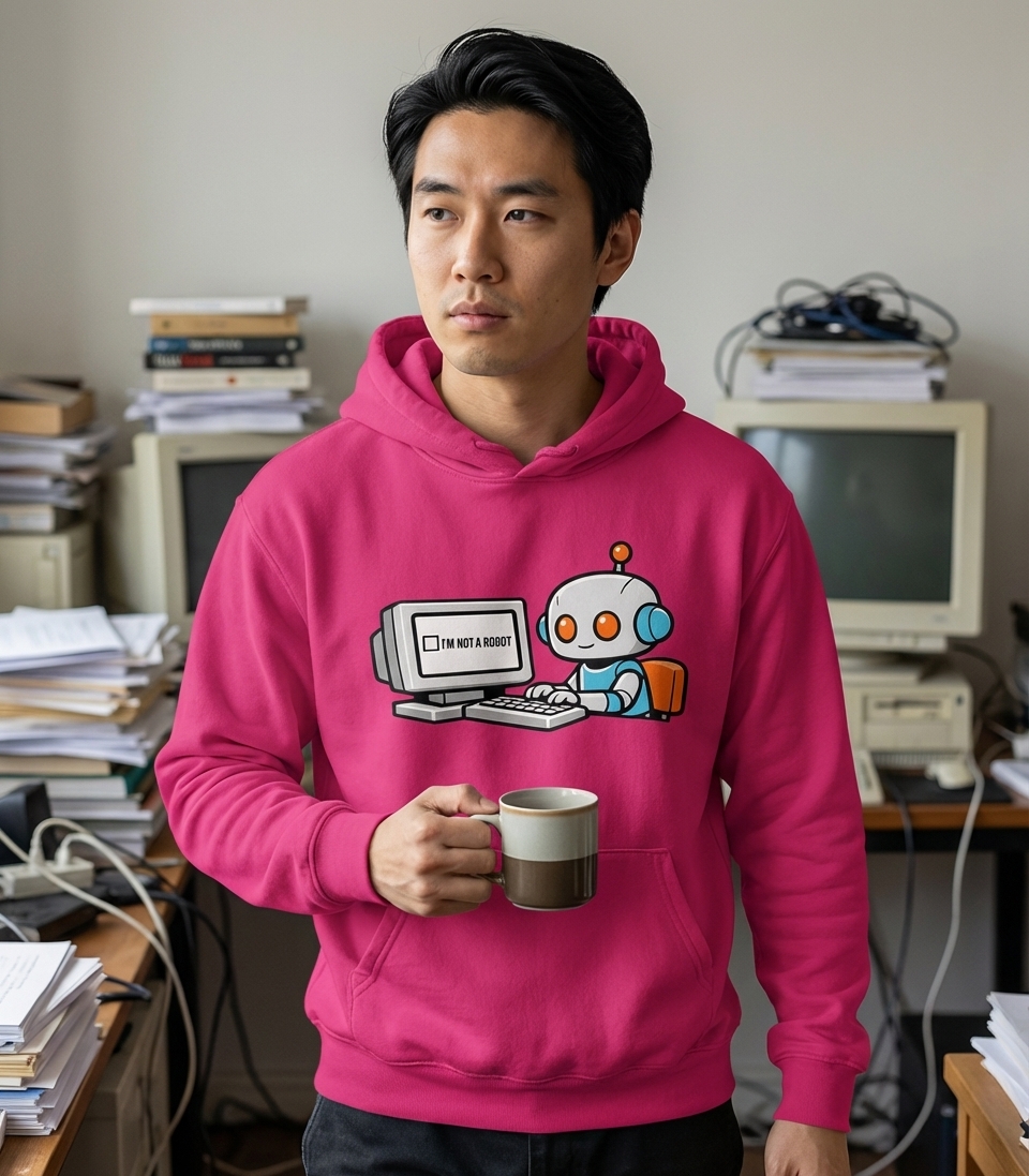 This design captures the ironic humor of tech enthusiasts and internet users who frequently encounter CAPTCHAs, playfully questioning machine identity.