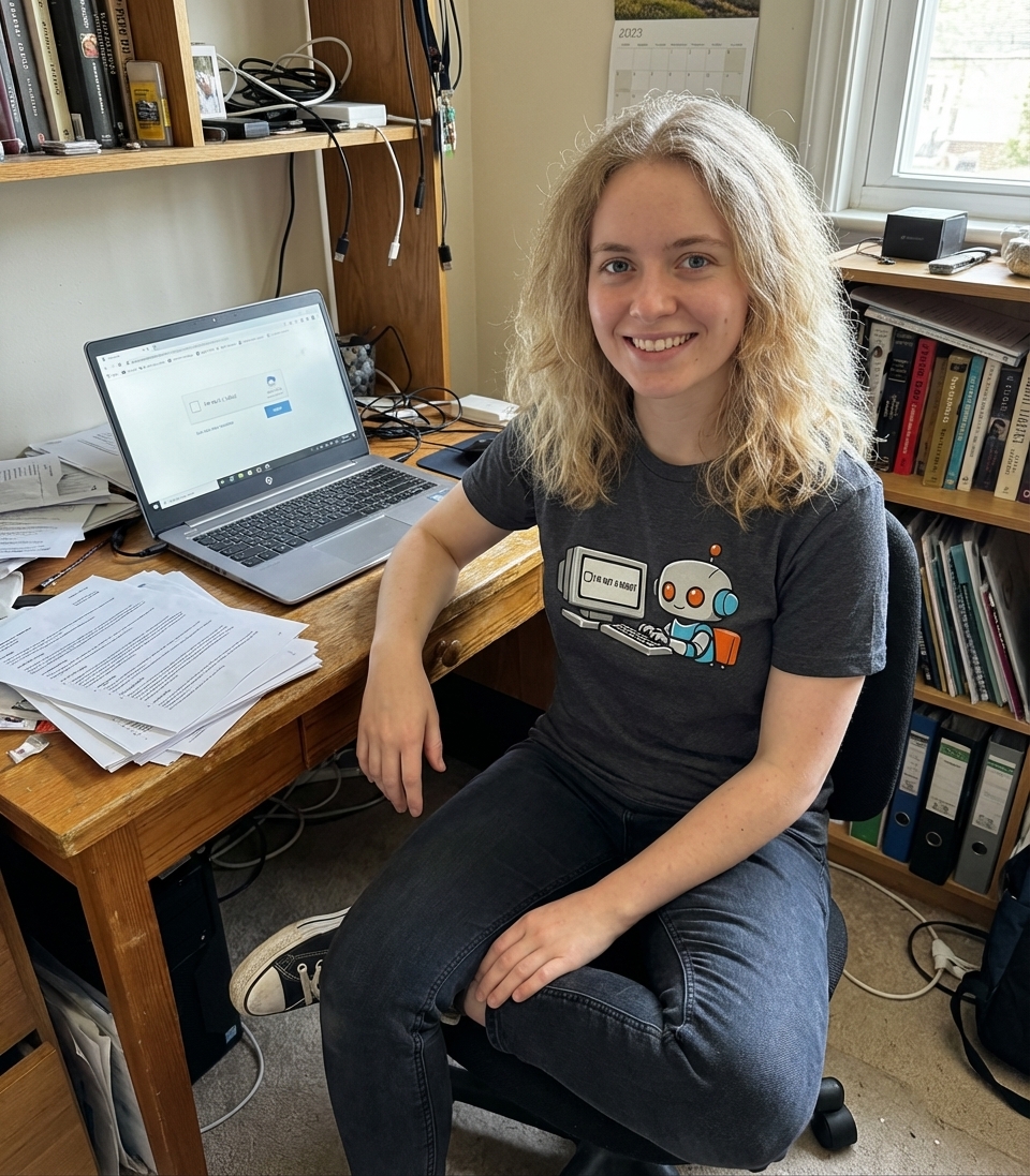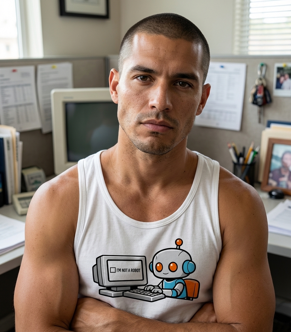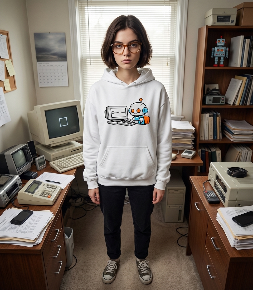 This design captures the ironic humor of tech enthusiasts and internet users who frequently encounter CAPTCHAs, playfully questioning machine identity.