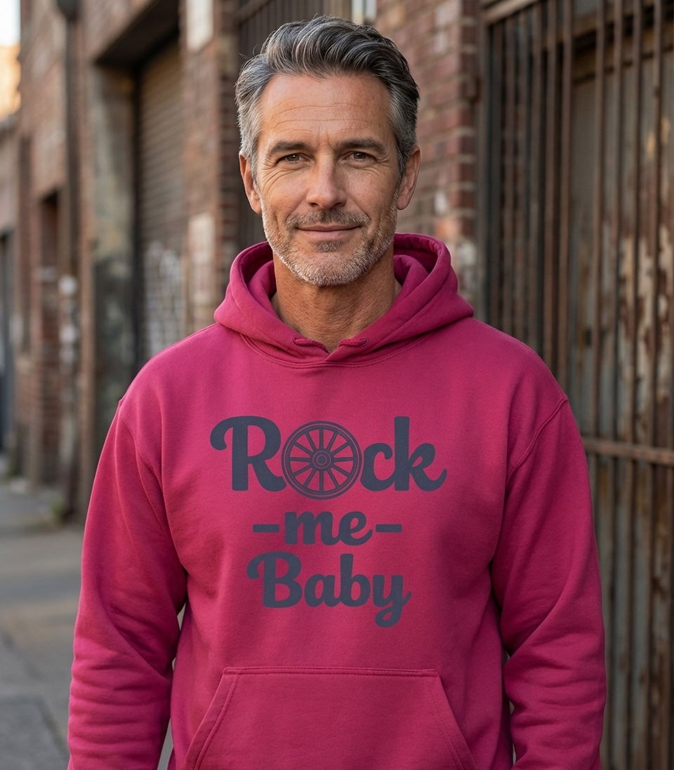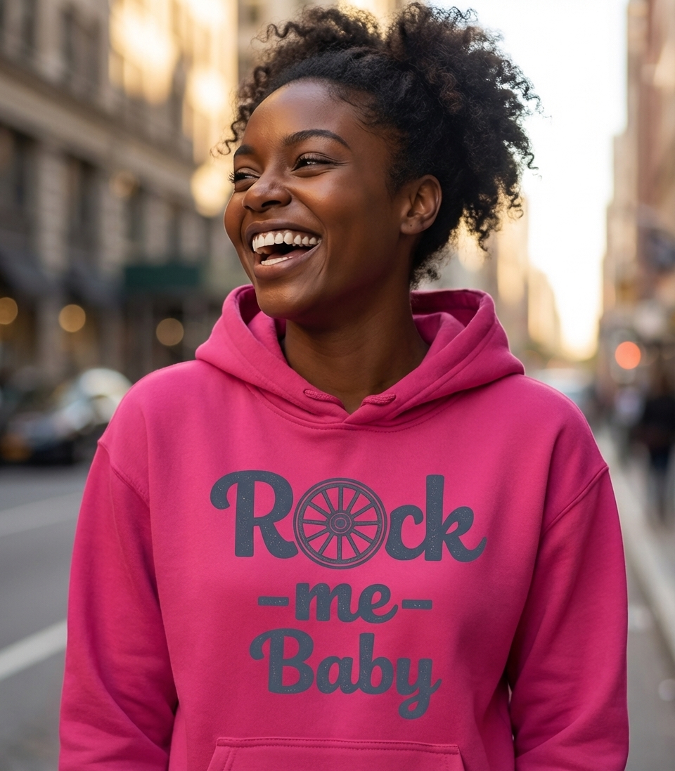 The "Rock Me Baby" phrase captures the lifestyle of music lovers who enjoy clever wordplay, classic tunes, and a touch of retro charm.