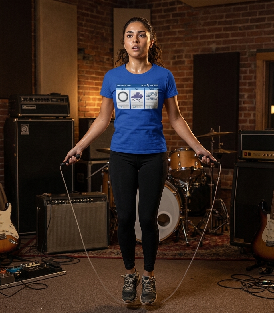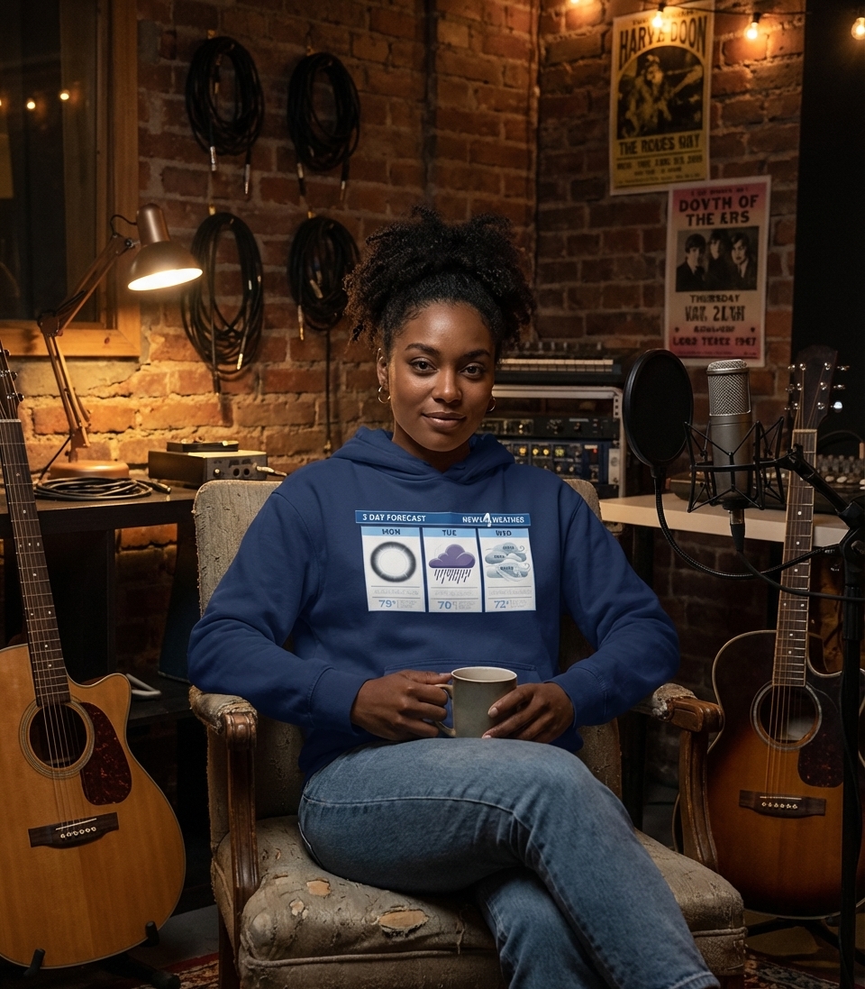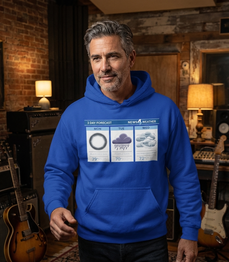 This humorous forecast captures the playful spirit of music lovers who enjoy classic rock, witty wordplay, and unique graphic tees.