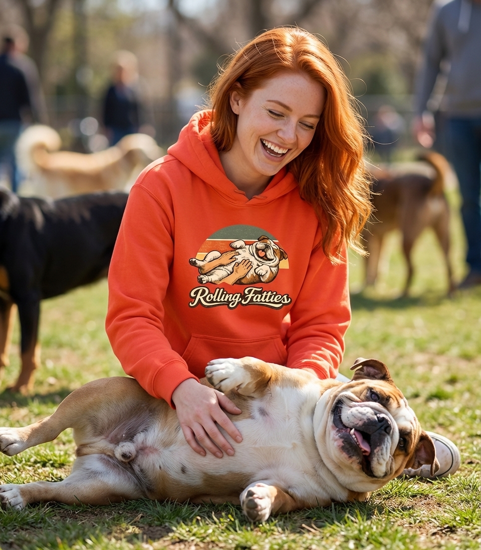 The 'Rolling Fatties' phrase captures the lifestyle of devoted dog parents who cherish giving belly rubs to their happy, plump bulldogs.
