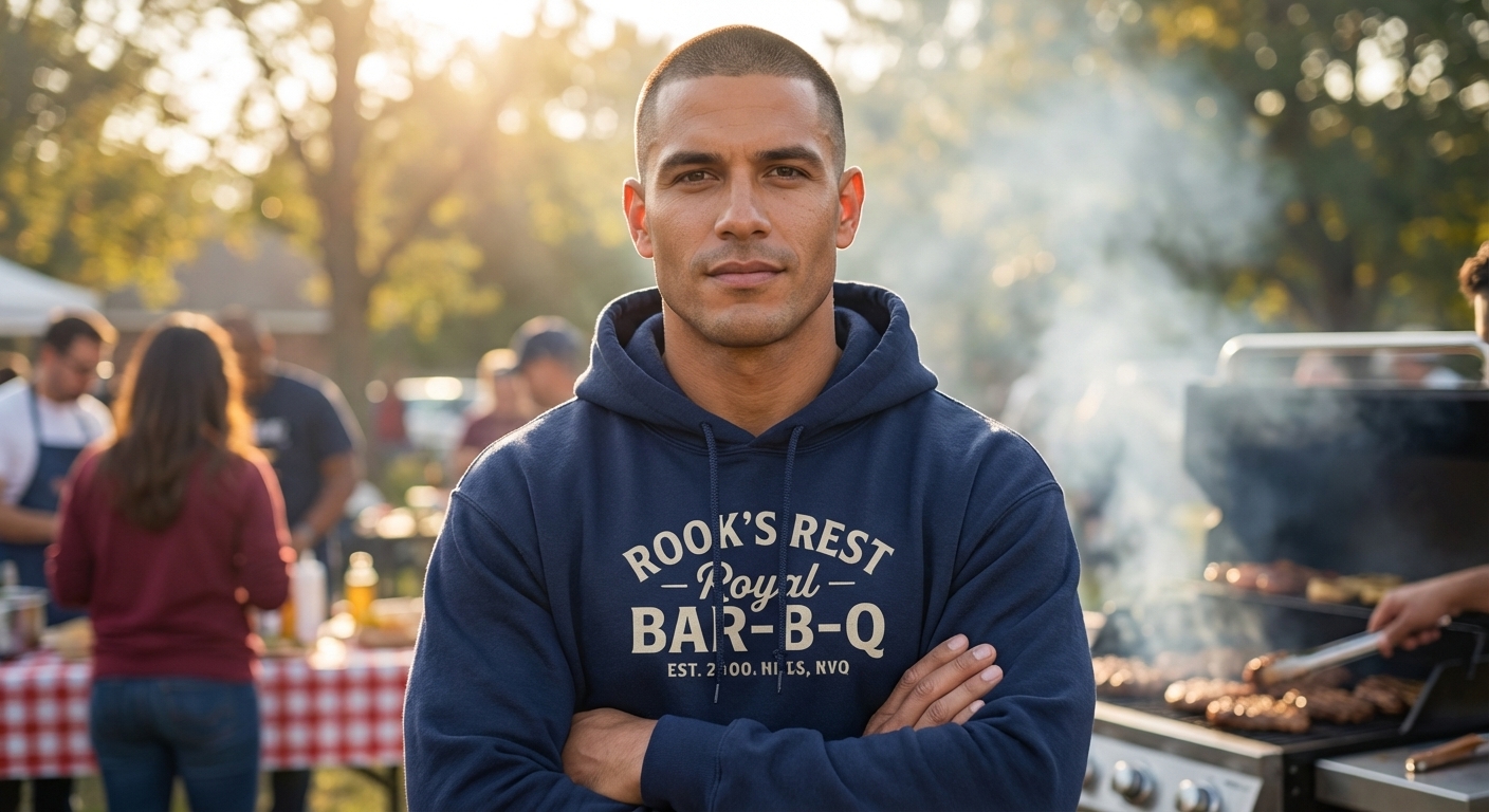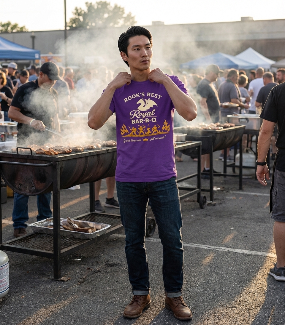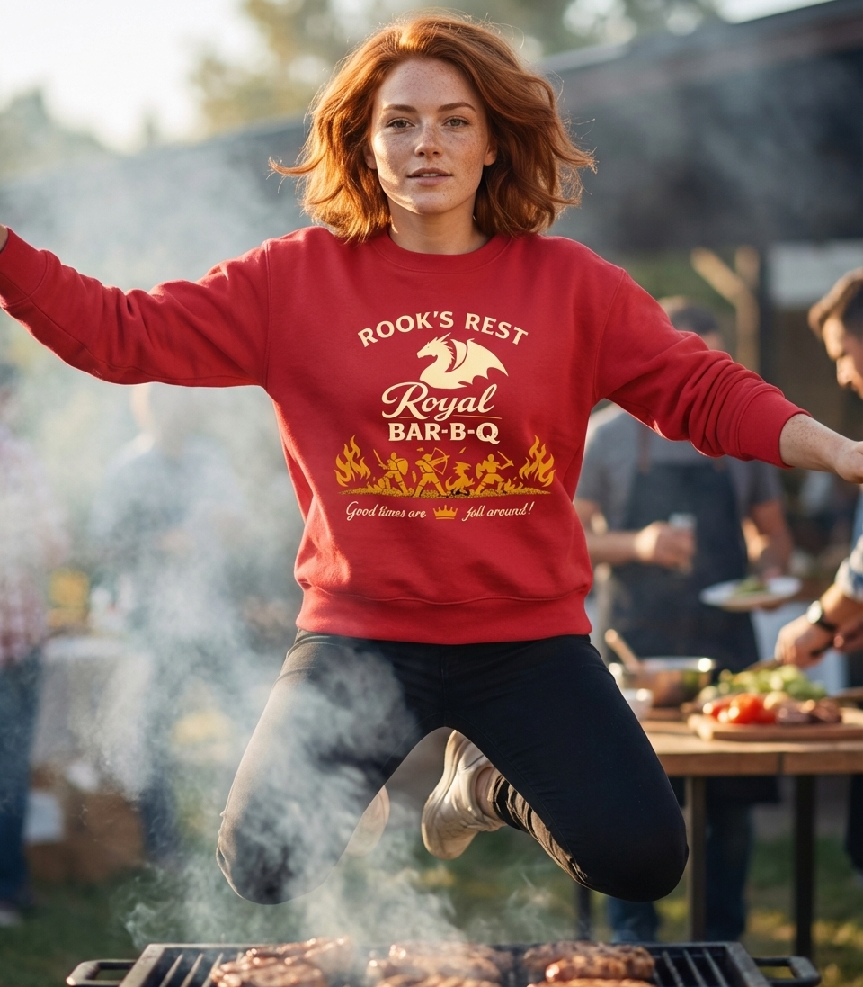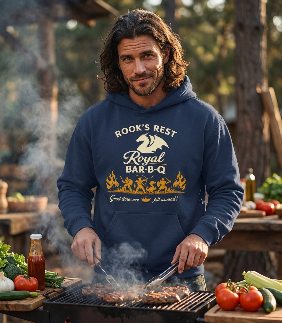 The "Rook's Rest Royal Bar-B-Q" design captures the playful spirit of fantasy enthusiasts who enjoy epic tales and delicious grilled food.