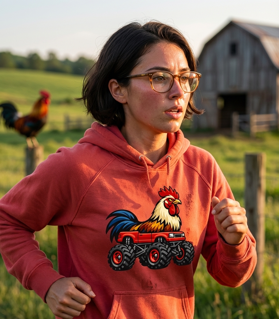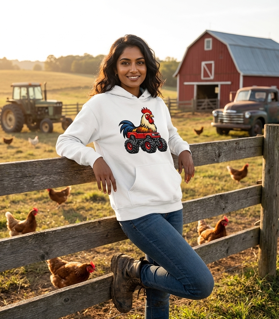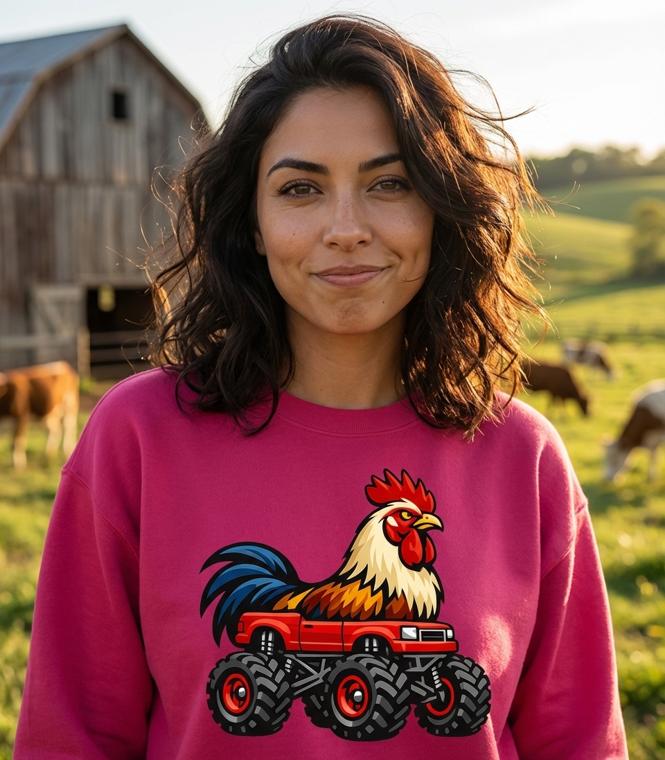 The "Rooster Monster Truck" design captures the unique style of fans who love farm animals, off-road adventures, and unexpected humor.