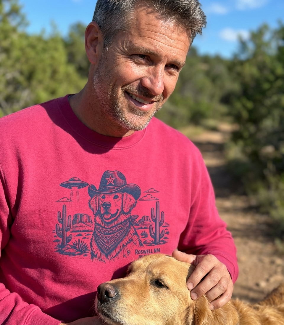 The design presents a charming Golden Retriever depicted as a cowboy, complete with a hat and bandana. This friendly canine is set against a classic desert landscape featuring cacti and mesas. A prominent UFO hovers above, casting an alien abduction beam, adding a mysterious sci-fi twist.