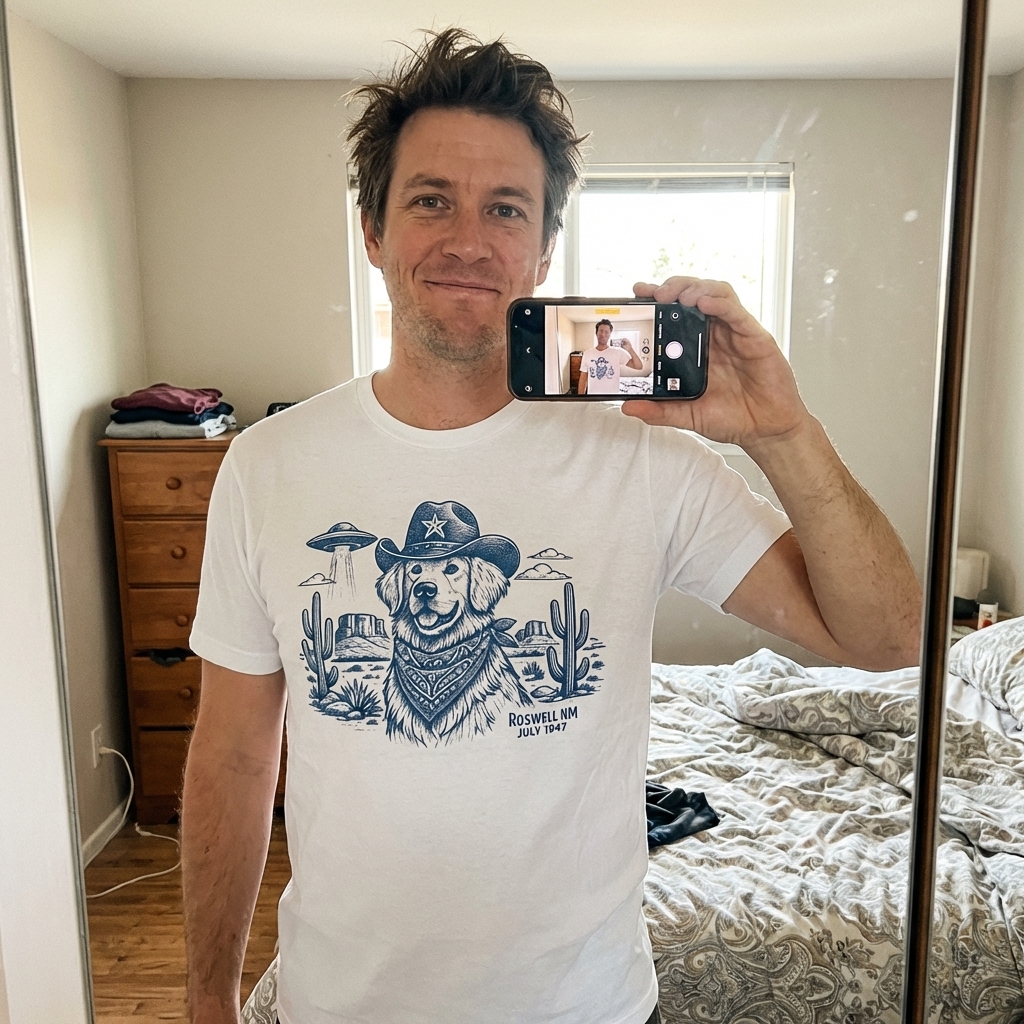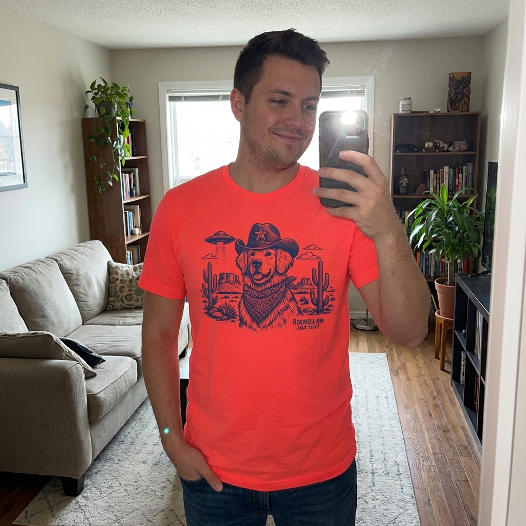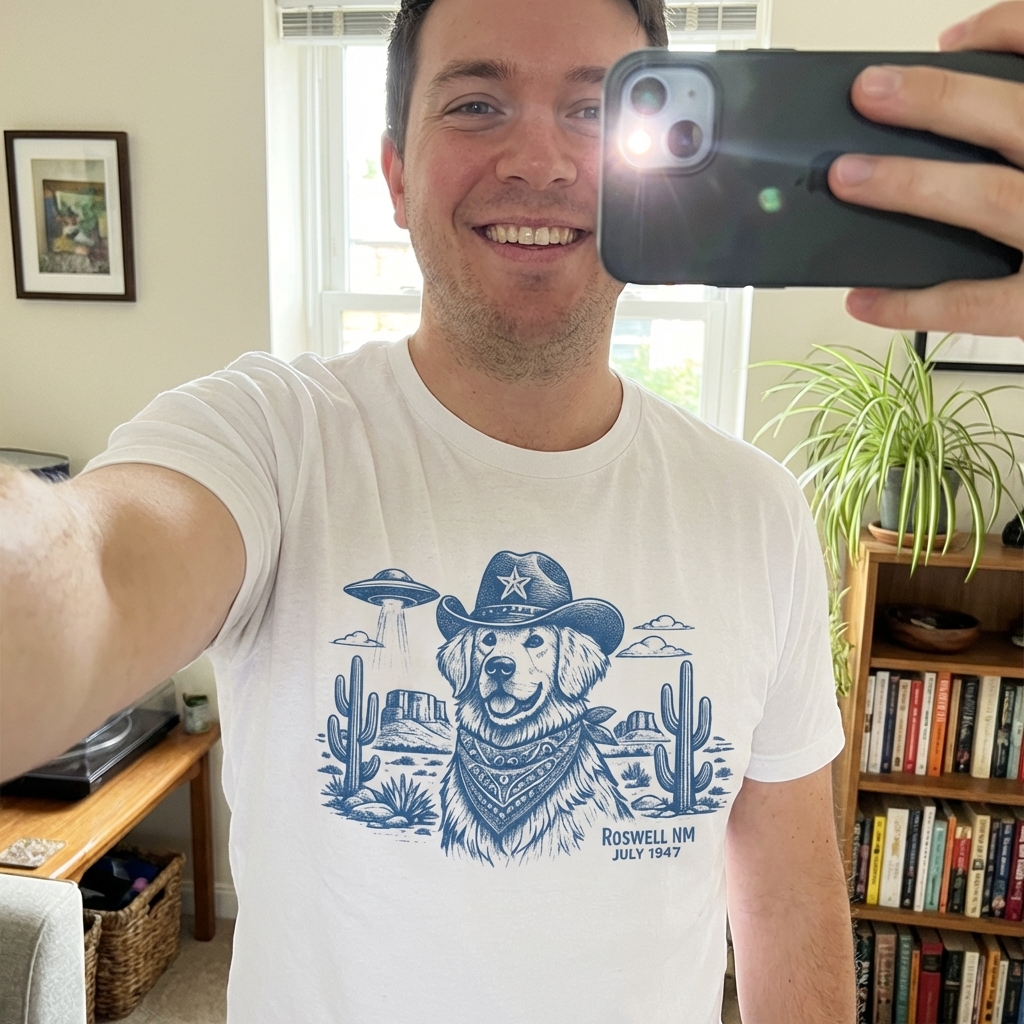 Got this shirt today and it's even better than I expected! The whole Roswell cowboy dog alien thing is such a fun, unique print that actually looks really good. Plus, it's super soft cotton, perfect for everyday wear.