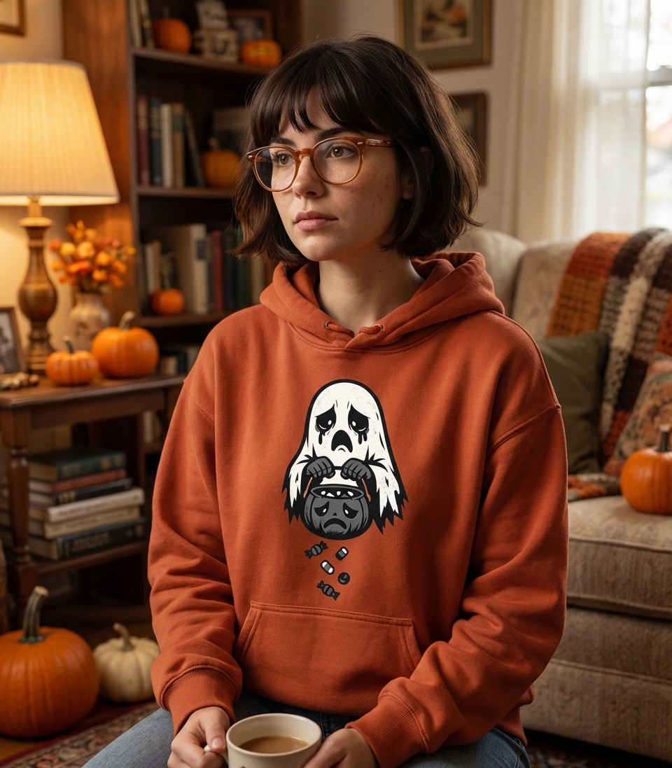 This design captures the relatable struggle of Halloween enthusiasts who sometimes experience the melancholy of lost treats.