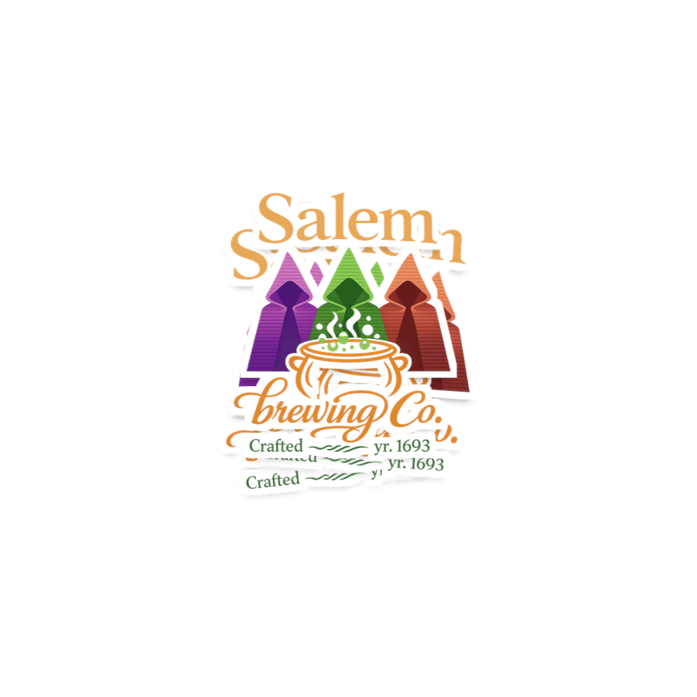 This graphic features a fictional "Salem Brewing Co." logo, playfully intertwining the historical lore of Salem, Massachusetts, with the art of craft brewing. Three hooded figures, suggestive of witches or mystics, gather around a bubbling cauldron, symbolizing the magical essence of the brew. The inclusion of "yr. 1693" anchors the design in the infamous period of the Salem Witch Trials.