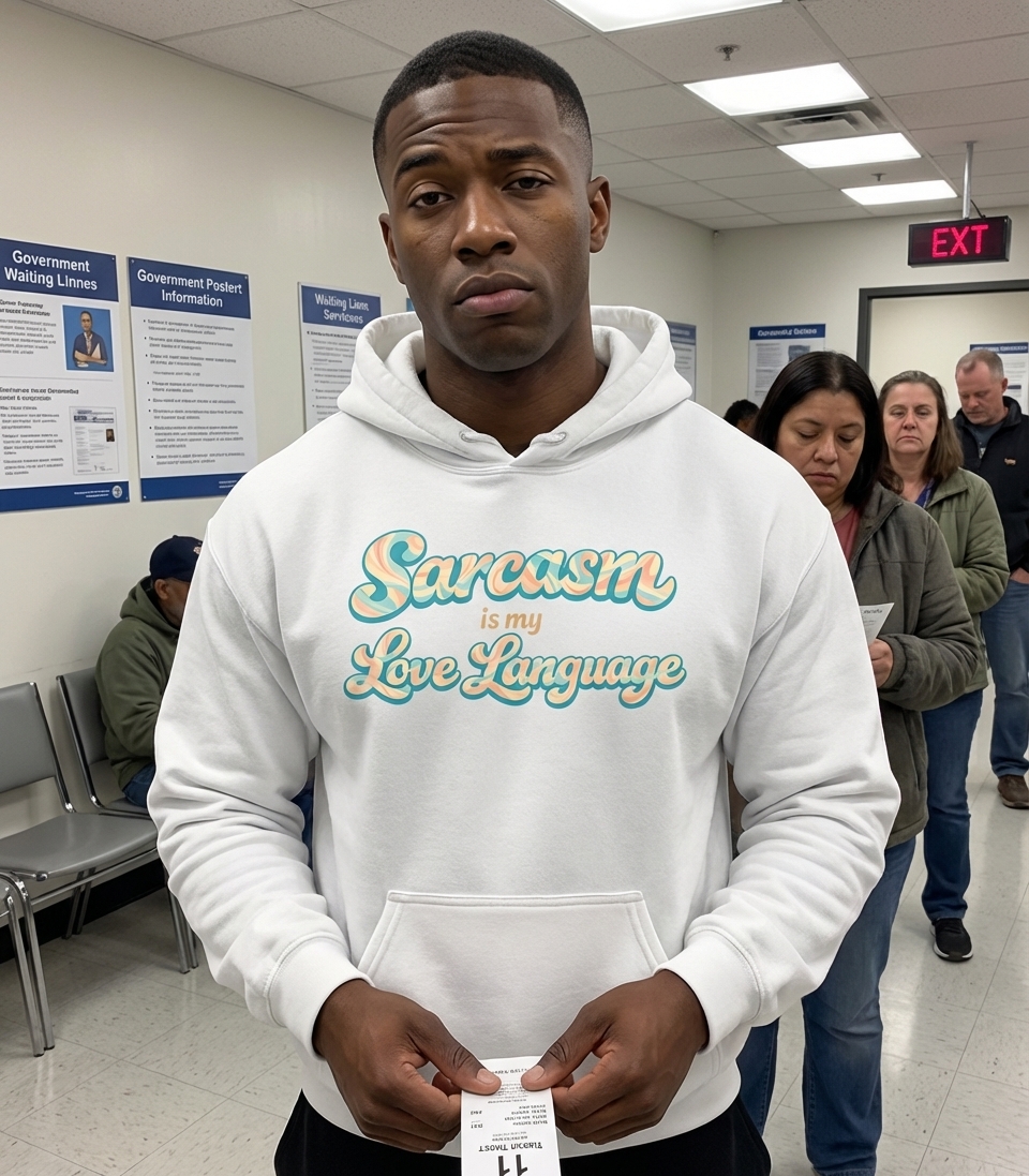This design features the popular phrase "Sarcasm is my Love Language" rendered in a distinctive retro aesthetic. The flowing, wavy typography evokes a nostalgic vibe, making it a unique statement piece.