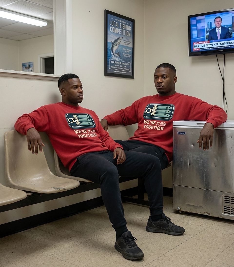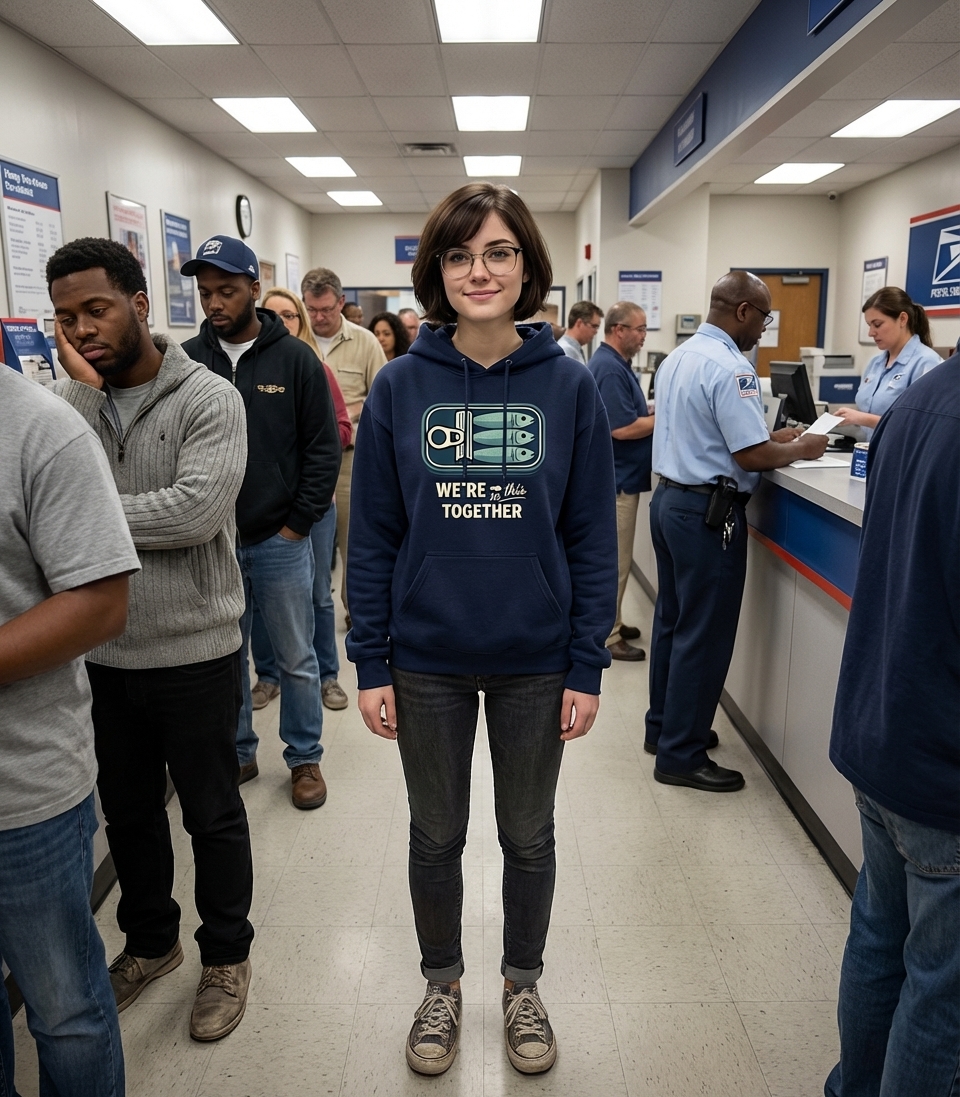 The phrase "We're in this Together" is a declaration of unity and mutual support, often used during difficult or challenging times. Here, it’s paired with the sardine illustration to create a humorous, relatable take on feeling a bit squeezed but enduring as a collective. It's a dry, witty commentary on shared experiences.