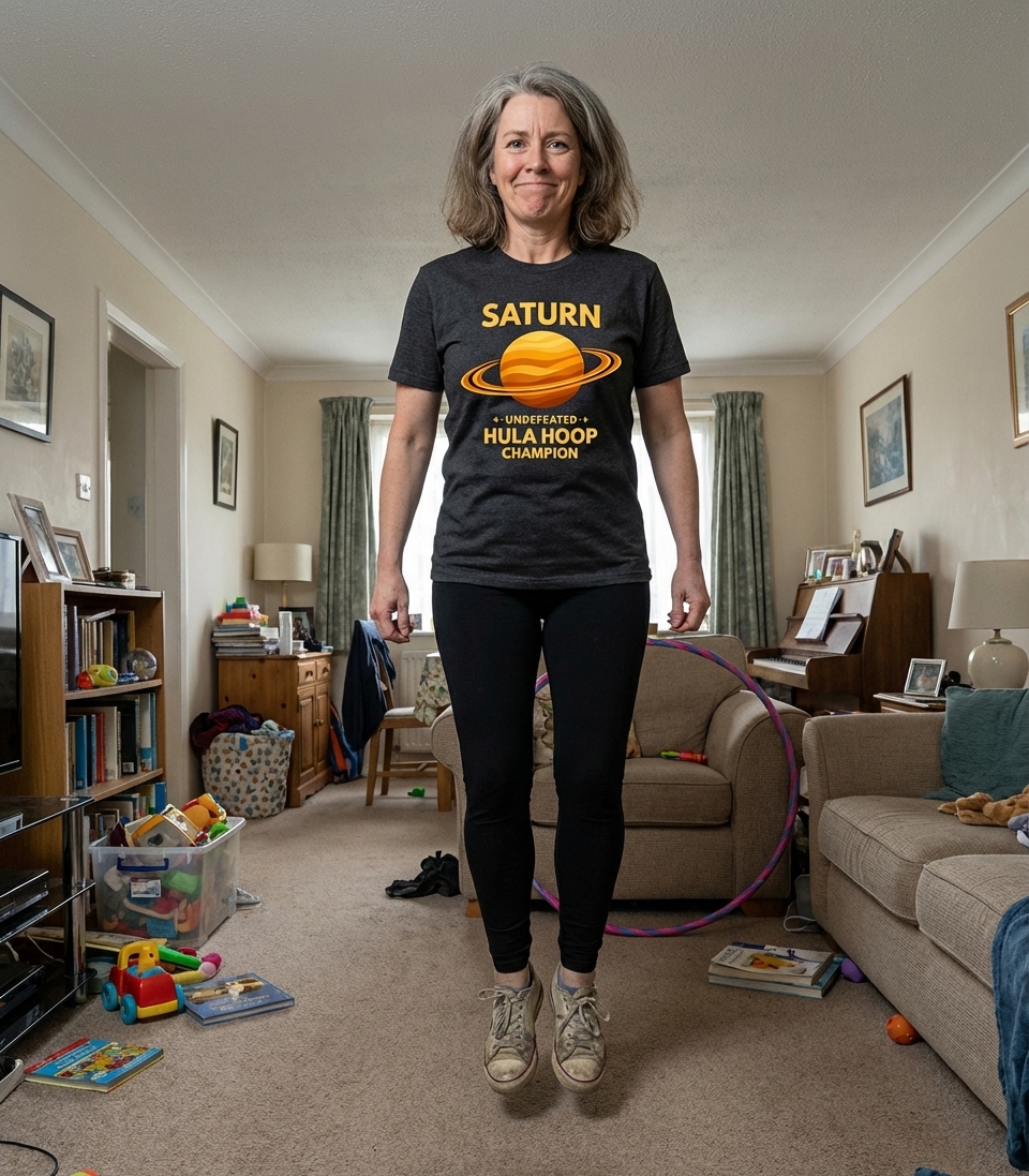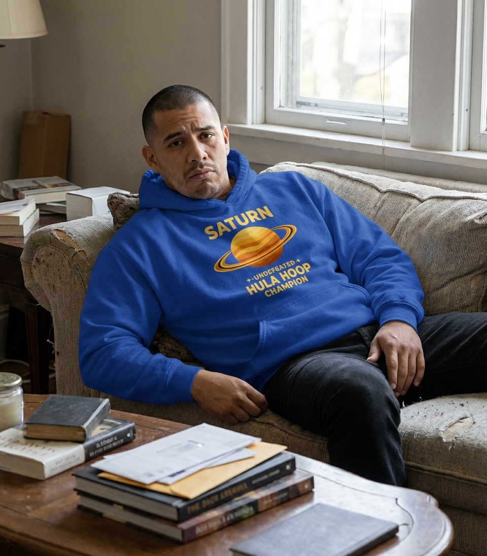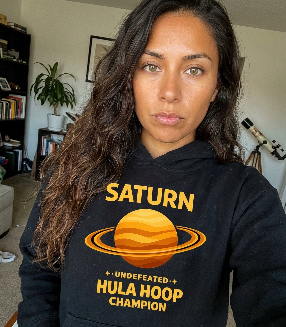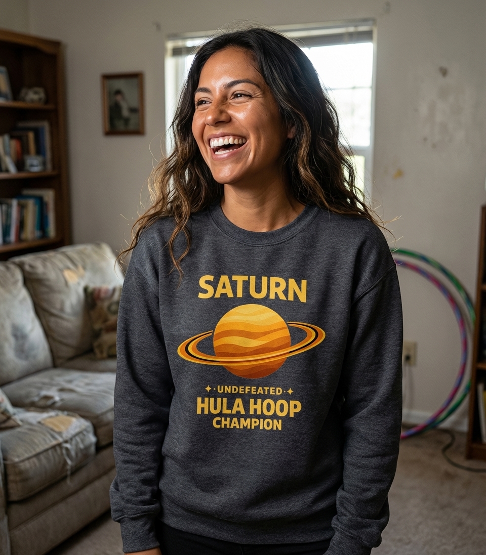 The phrase "Saturn Undefeated Hula Hoop Champion" is a clever, humorous take on Saturn's rings, playfully comparing them to a hula hoop. The "undefeated champion" status emphasizes the planet's unique and permanent ring system, making it a cosmic pun enjoyed by science and humor lovers alike.