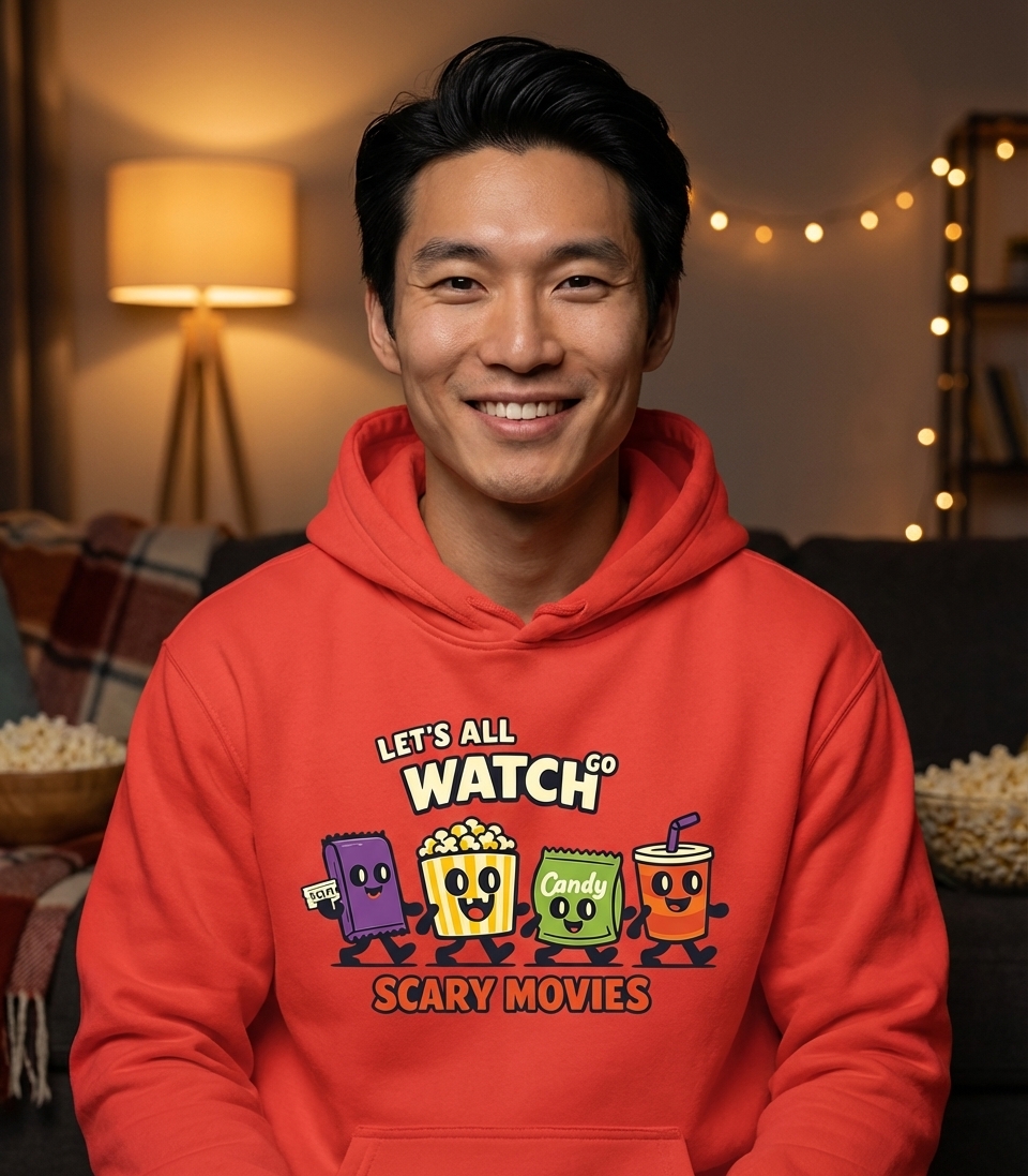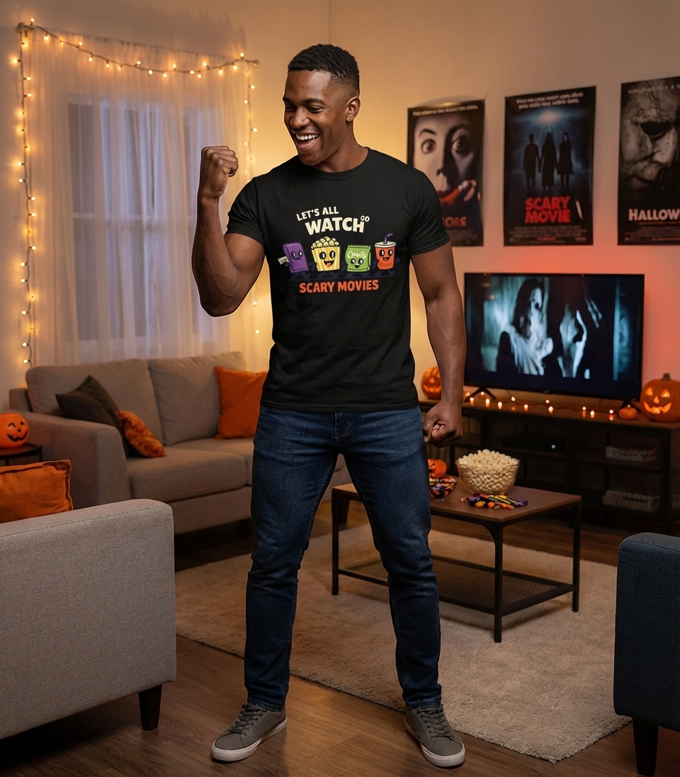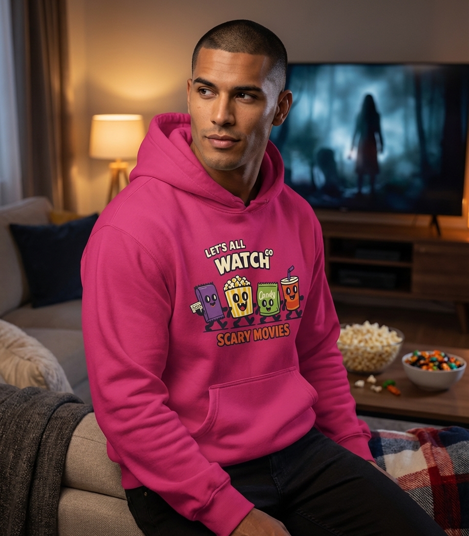 This design captures the cozy excitement of friends gathering for a scary movie night, complete with all the essential snacks.