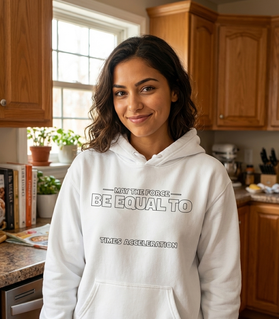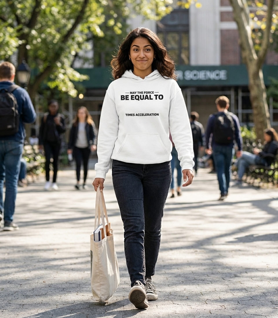 The phrase "May the Force Be Equal To Times Acceleration" is a clever twist on the iconic "May the Force be with you" from Star Wars, reimagining it through the lens of Newton's Second Law of Motion: F=ma (Force equals mass times acceleration). It's a pun that resonates with fans of both sci-fi and science, celebrating the intersection of popular culture and educational concepts.