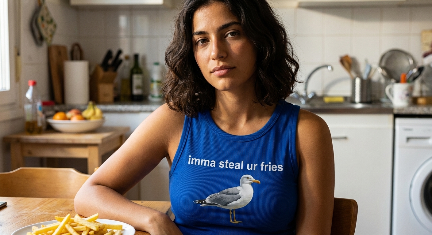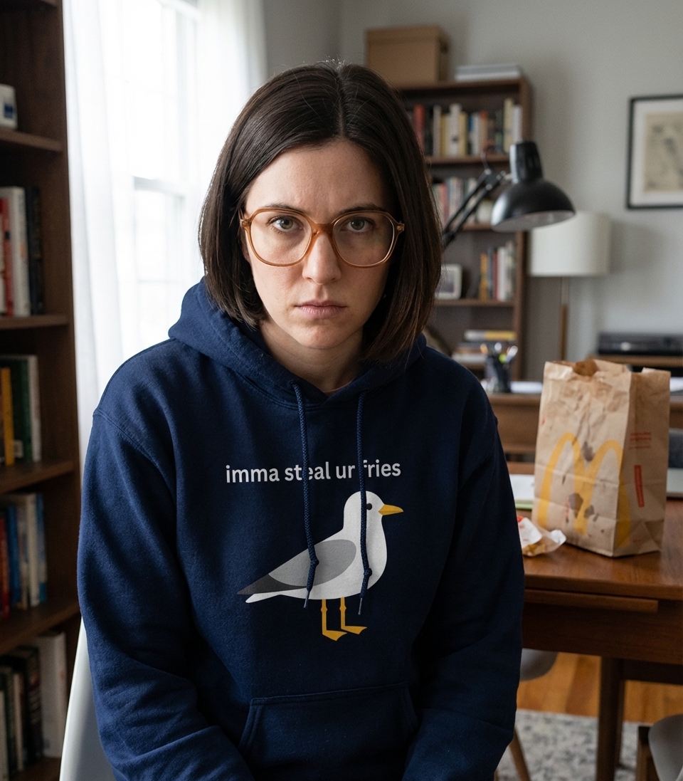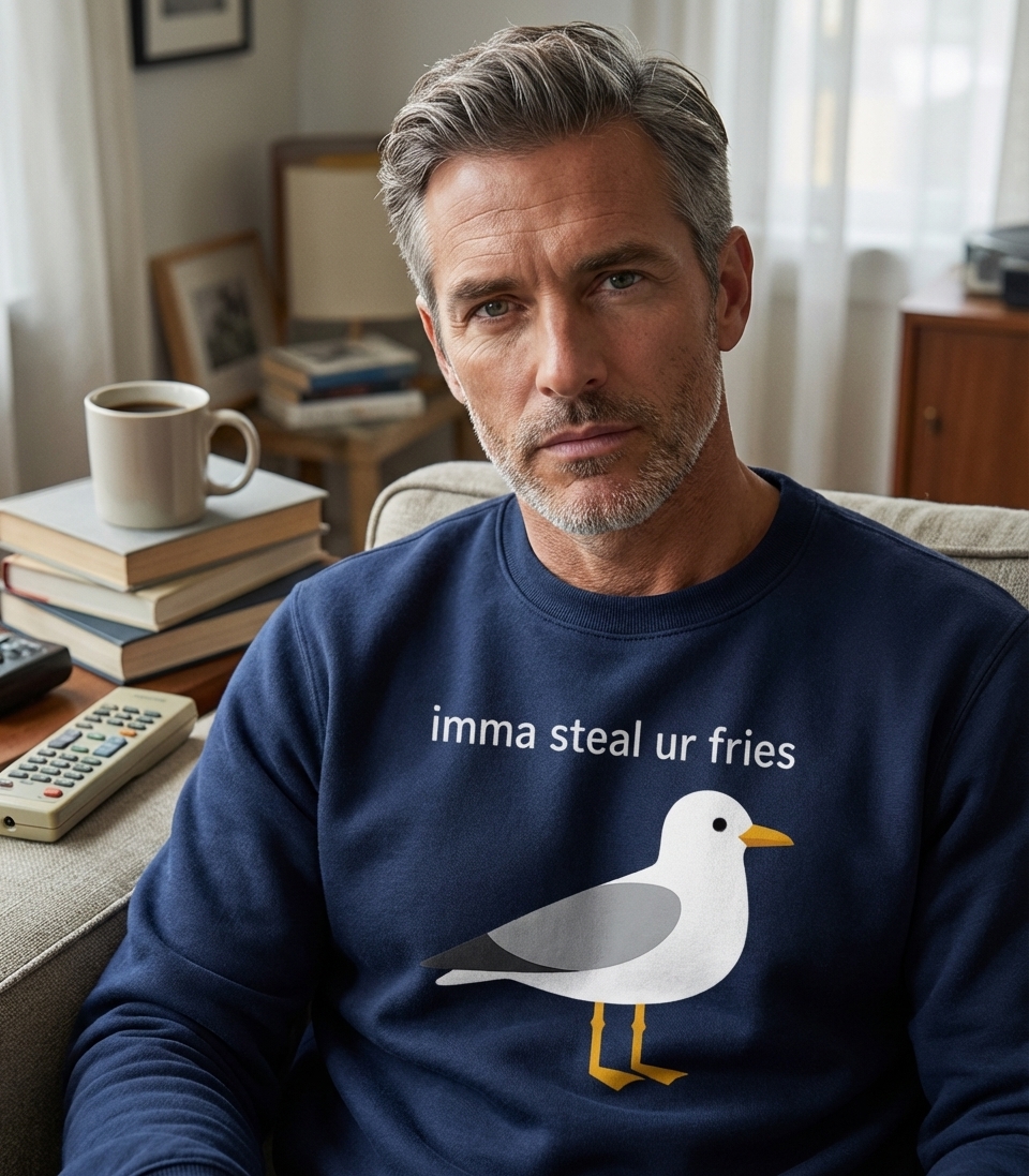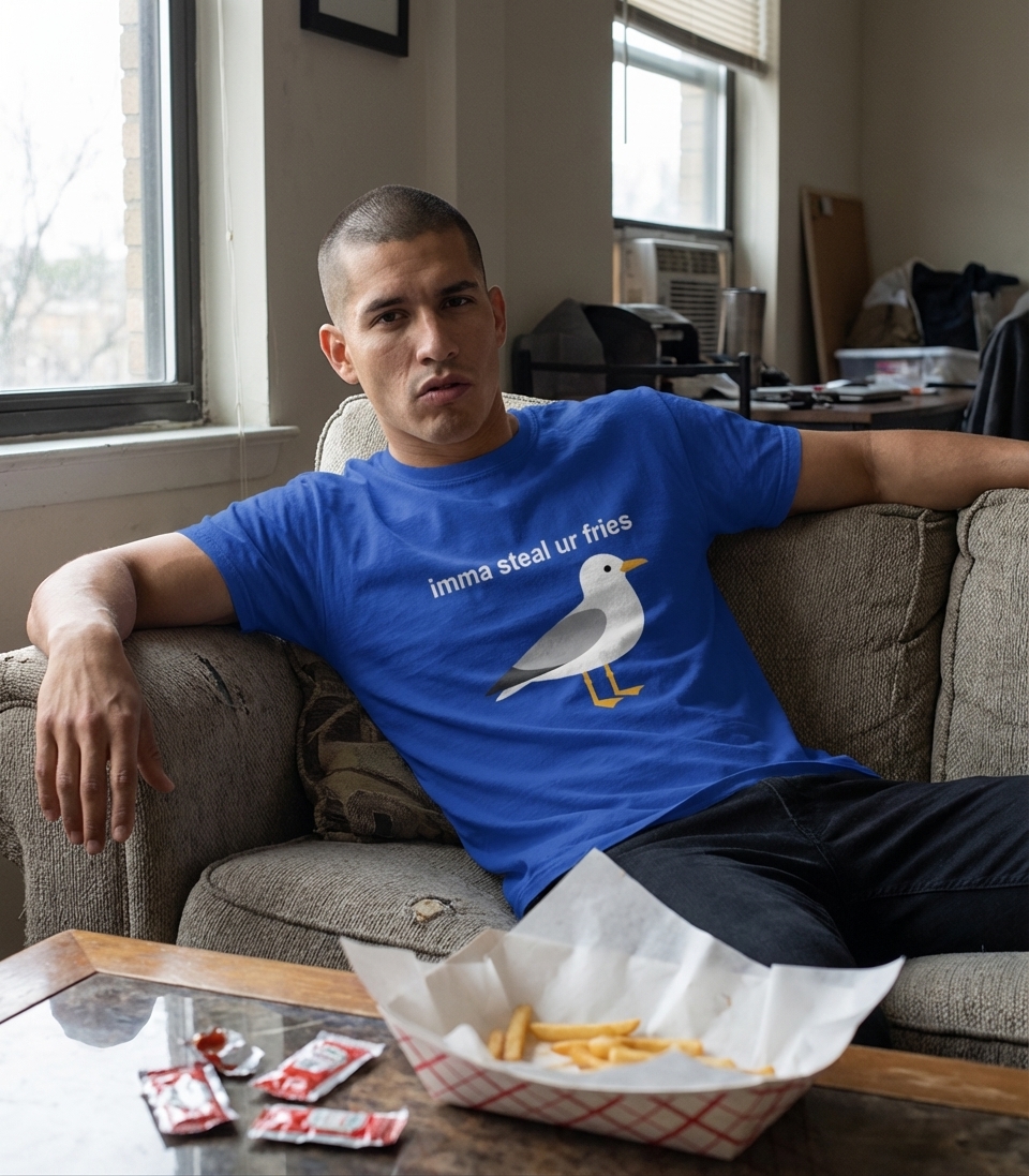 The 'Imma Steal Ur Fries' phrase captures the lifestyle of hungry seagulls who lurk near beaches, picnic areas, and outdoor cafes.
