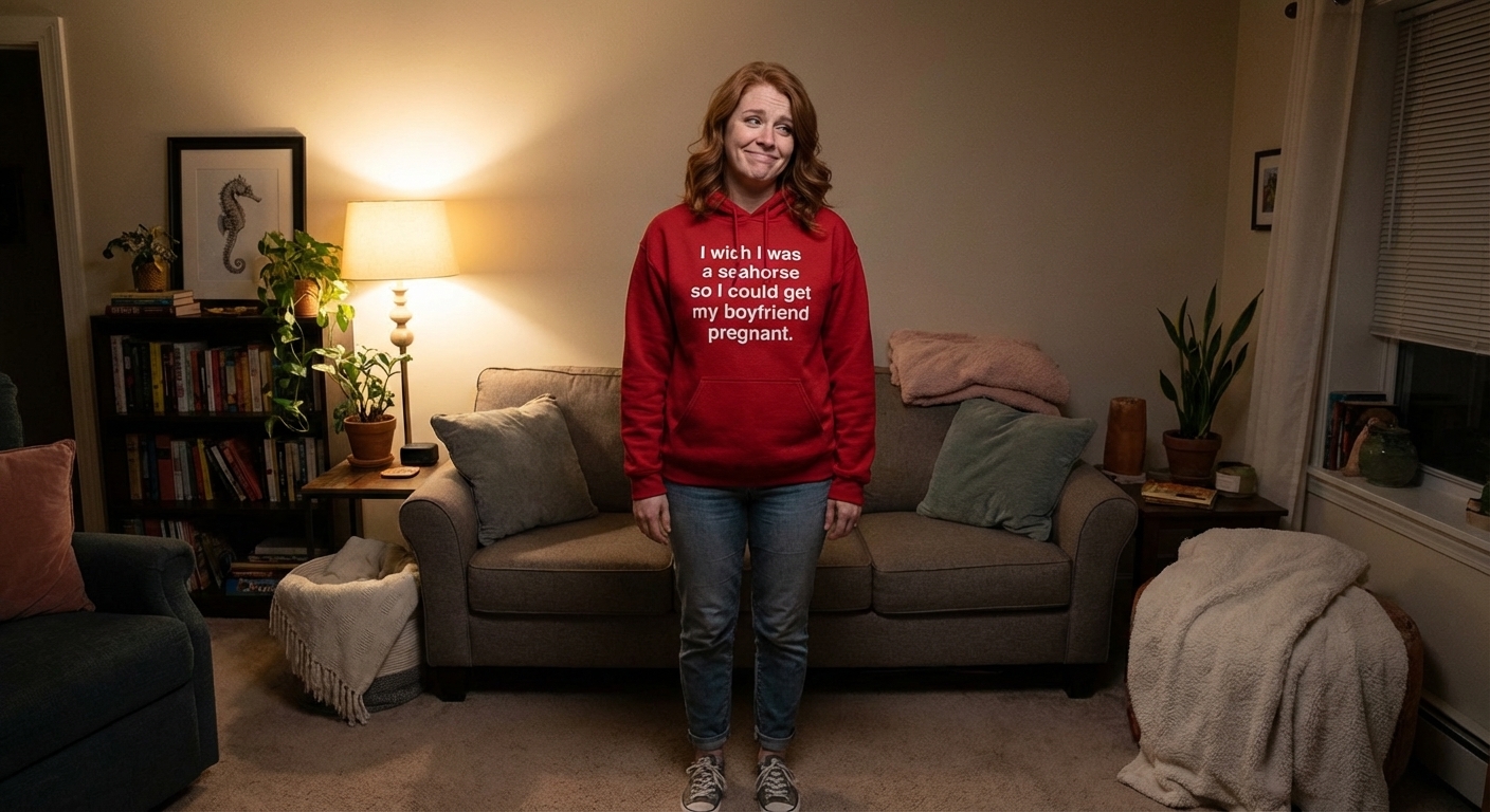 This design presents a witty and whimsical thought, drawing inspiration from the unique reproductive cycle of seahorses. It’s a playful twist on traditional roles, using a fascinating biological fact to craft an amusing personal wish.