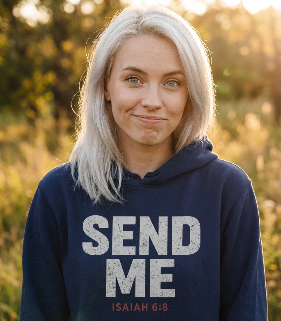 The "Send Me" phrase captures the lifestyle of devoted Christians who are ready to answer God's call, serve others, and spread the message.